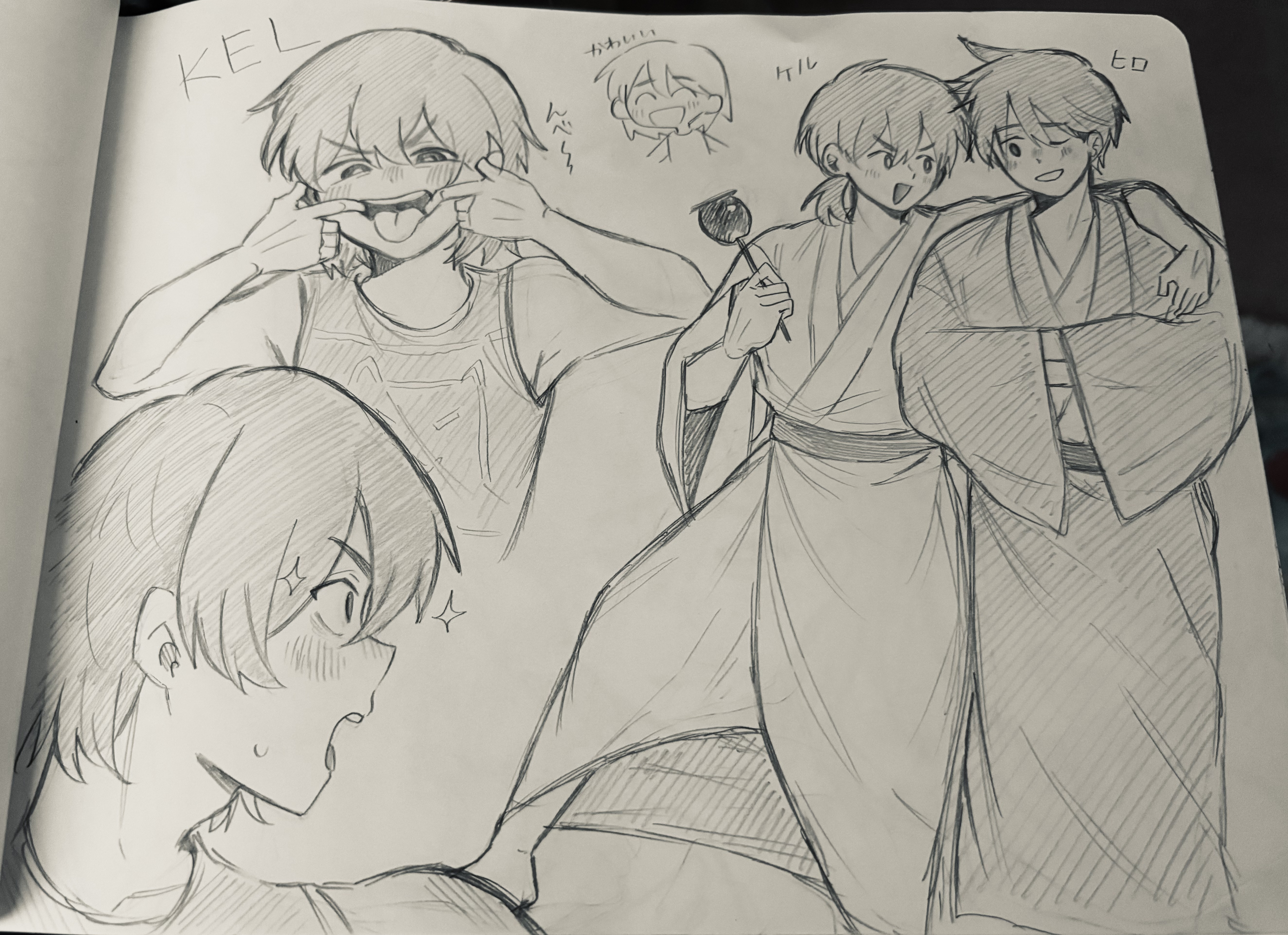 2boys absurdres alternate_costume alternate_hairstyle blush bright_pupils brothers commentary_request double-parted_bangs greyscale hair_between_eyes hero_(faraway)_(omori) hero_(omori) highres japanese_clothes kel_(faraway)_(omori) kel_(omori) kimono long_sleeves looking_at_viewer low_ponytail male_focus monochrome mouth_pull multiple_boys omori one_eye_closed open_mouth pasuta928008 ponytail short_ponytail siblings smile teeth tongue tongue_out traditional_media translated upper_teeth_only