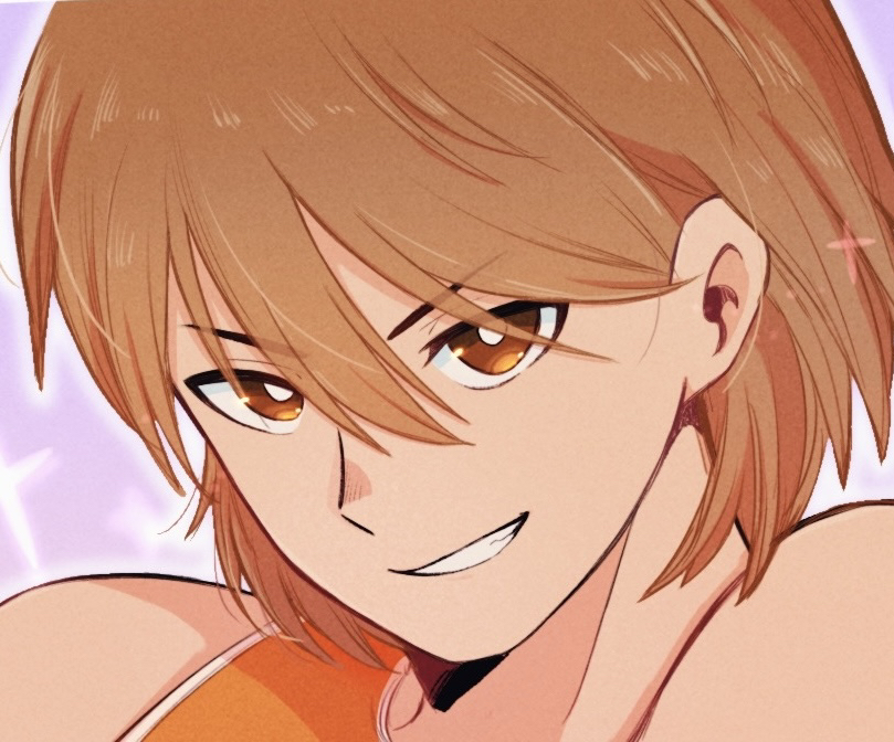 1boy :d bright_pupils brown_eyes brown_hair commentary_request dark-skinned_male dark_skin double-parted_bangs film_grain grin hair_behind_ear hair_between_eyes kel_(faraway)_(omori) kel_(omori) looking_at_viewer male_focus omori open_mouth orange_tank_top outline pasuta928008 portrait purple_background short_hair simple_background smile solo sparkle tank_top v-shaped_eyebrows white_outline white_pupils