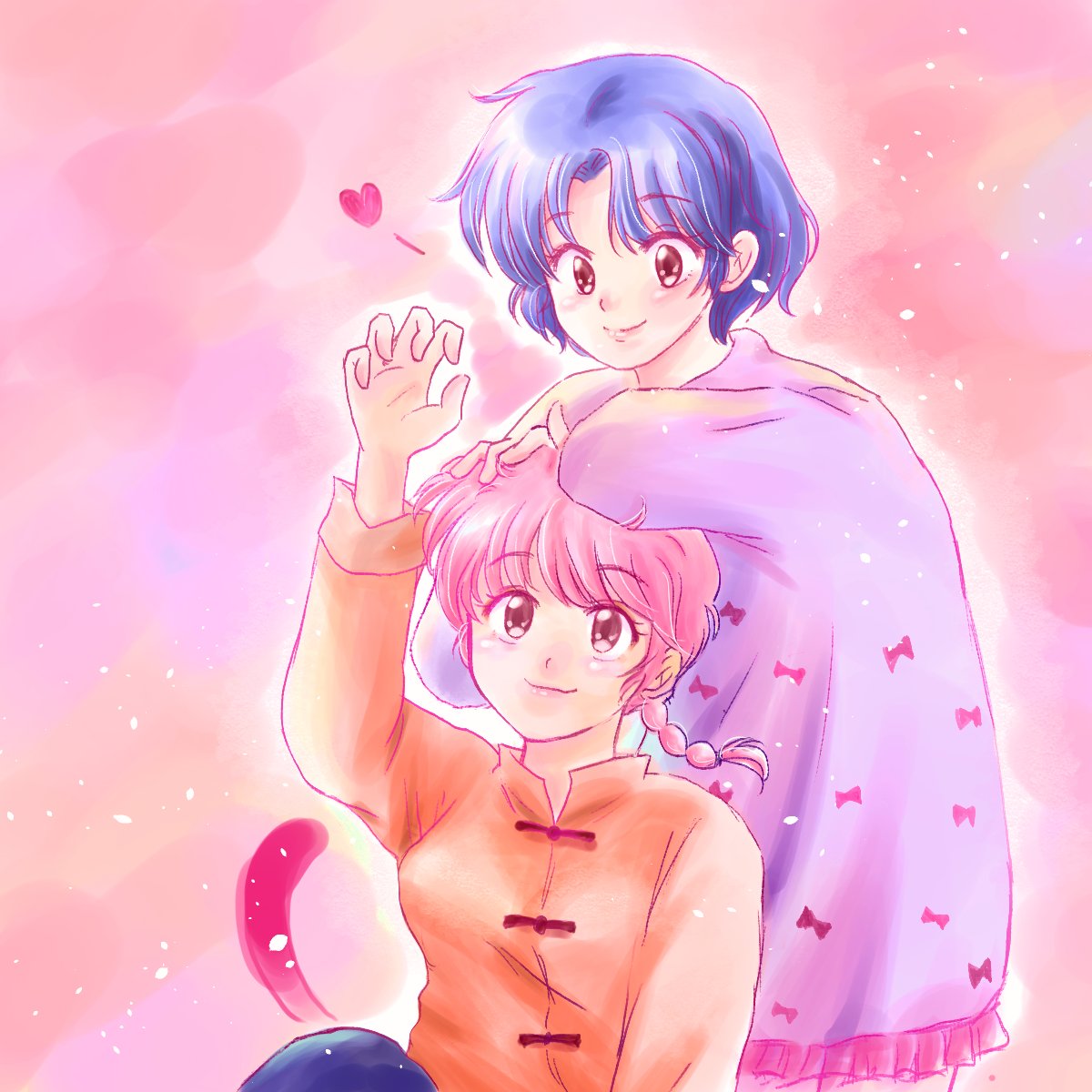 2girls arm_up bad_anatomy blue_hair braid brown_eyes cat_tail chinese_clothes closed_mouth commentary_request dress fuwariko hand_on_another's_head heart highres multiple_girls nekoken_technique pink_background pink_hair pink_tail purple_dress ranma-chan ranma_1/2 short_hair single_braid tail tendou_akane yuri