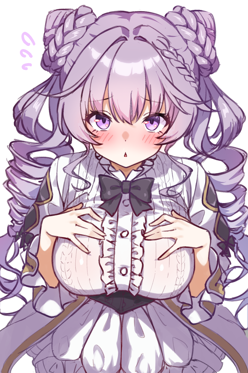 black_bow black_corset blush bow commentary_request corset donut_hair_bun double_bun dress drill_hair duel_monster hair_bun highres hr.r purple_eyes purple_hair selettrice_vaalmonica twin_drills white_dress yu-gi-oh!