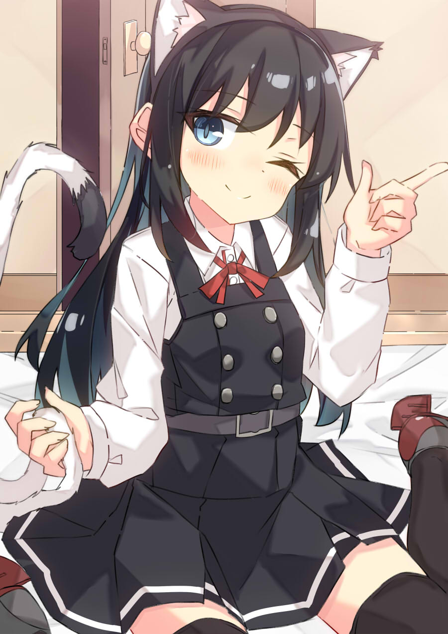 1girl animal_ears asashio_(kancolle) asashio_kai_ni_(kancolle) beritabo black_hair black_thighhighs blue_eyes cat_ears cat_tail dress highres long_hair long_sleeves one_eye_closed pinafore_dress shirt sitting sleeveless sleeveless_dress solo tail thighhighs white_shirt