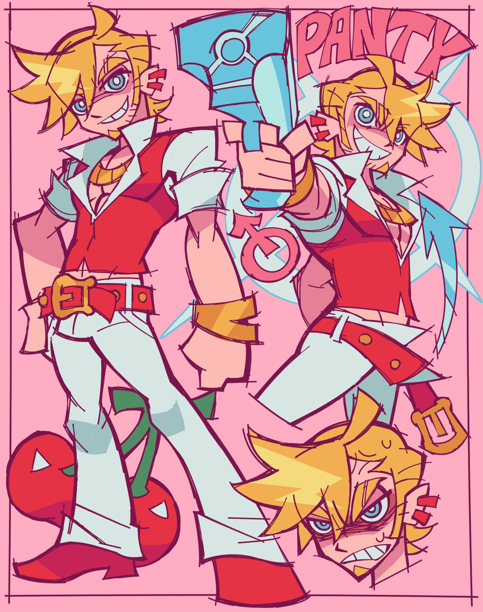 anger_vein belt blonde_hair blue_eyes bracelet bright_pupils character_name cherry earrings eyebrow_cut facial_hair food frown fruit genderswap genderswap_(ftm) goatee gold_bracelet gold_buckle gold_necklace grin gun highres holding holding_gun holding_weapon jewelry male_focus mars_symbol multiple_views necklace panties panty_&_stocking_with_garterbelt panty_(psg) partially_open_jacket pink_theme red_shoes red_vest shirt shoes sideburns sleeves_rolled_up smile stubble sweatdrop the_noodle_(onebadnoodle) underwear vest weapon white_panties white_pupils white_shirt