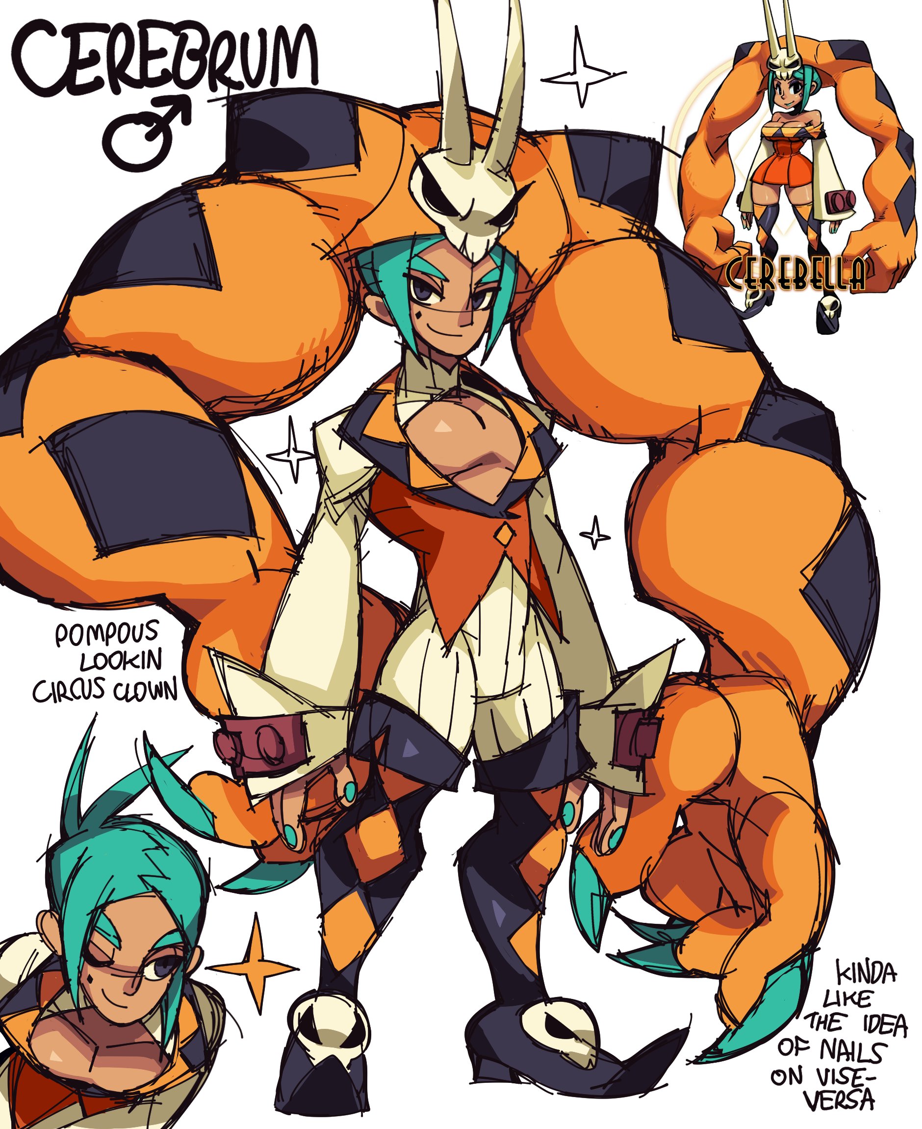 1boy black_eyes blue_hair blue_nails boots cerebella_(skullgirls) english_text fingernails highres long_fingernails male_focus mars_symbol multiple_views one_eye_closed orange_vest pectoral_cleavage pectorals reference_inset sharp_fingernails simple_background skull_print skullgirls sparkle the_noodle_(onebadnoodle) thick_eyebrows thigh_boots vest vice-versa_(skullgirls) white_background