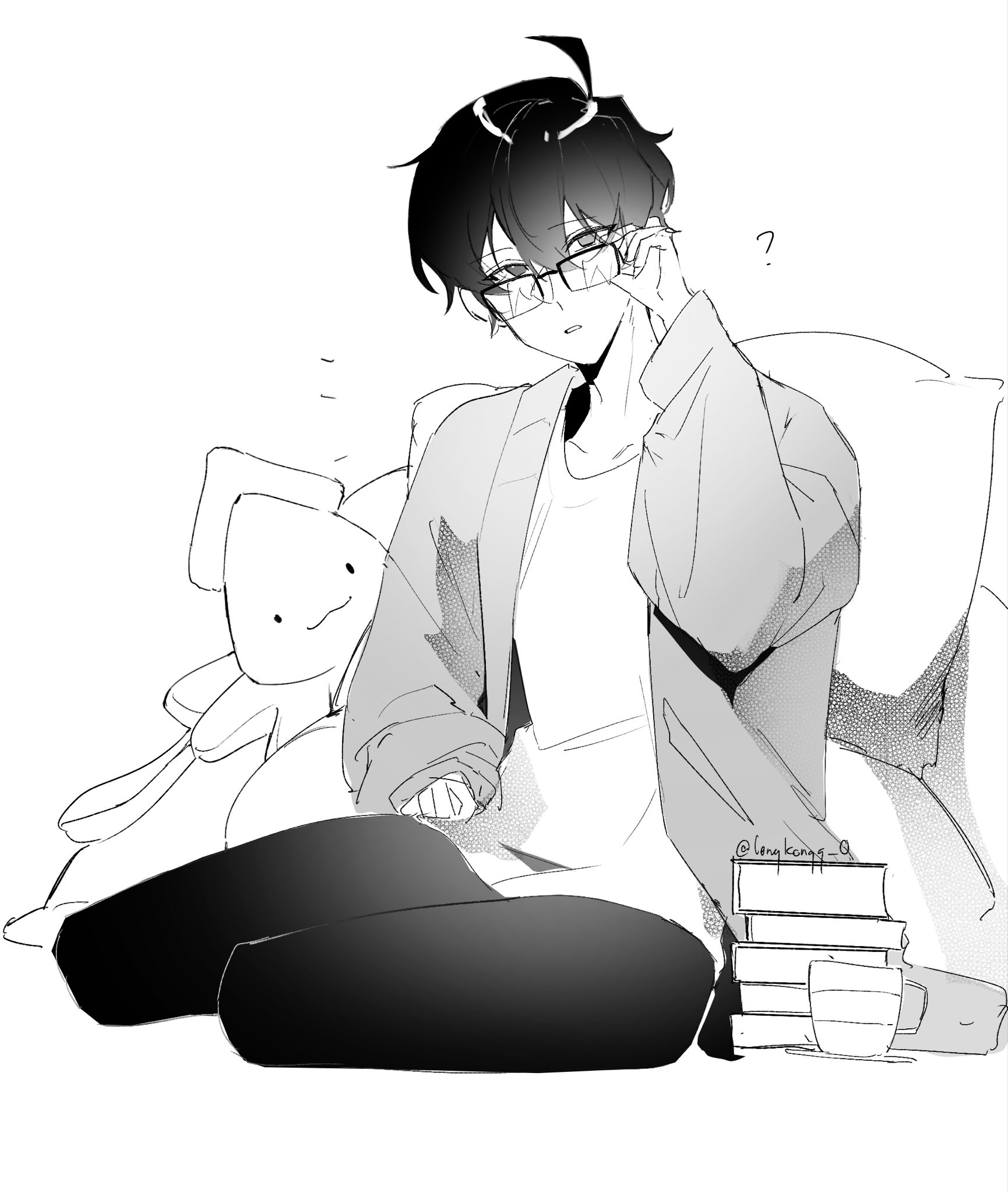 1boy ? adjusting_eyewear bespectacled book book_stack cardigan cup full_body glasses highres kim_dokja lengkongg_0 looking_at_viewer male_focus omniscient_reader's_viewpoint pillow_stack short_hair sitting solo