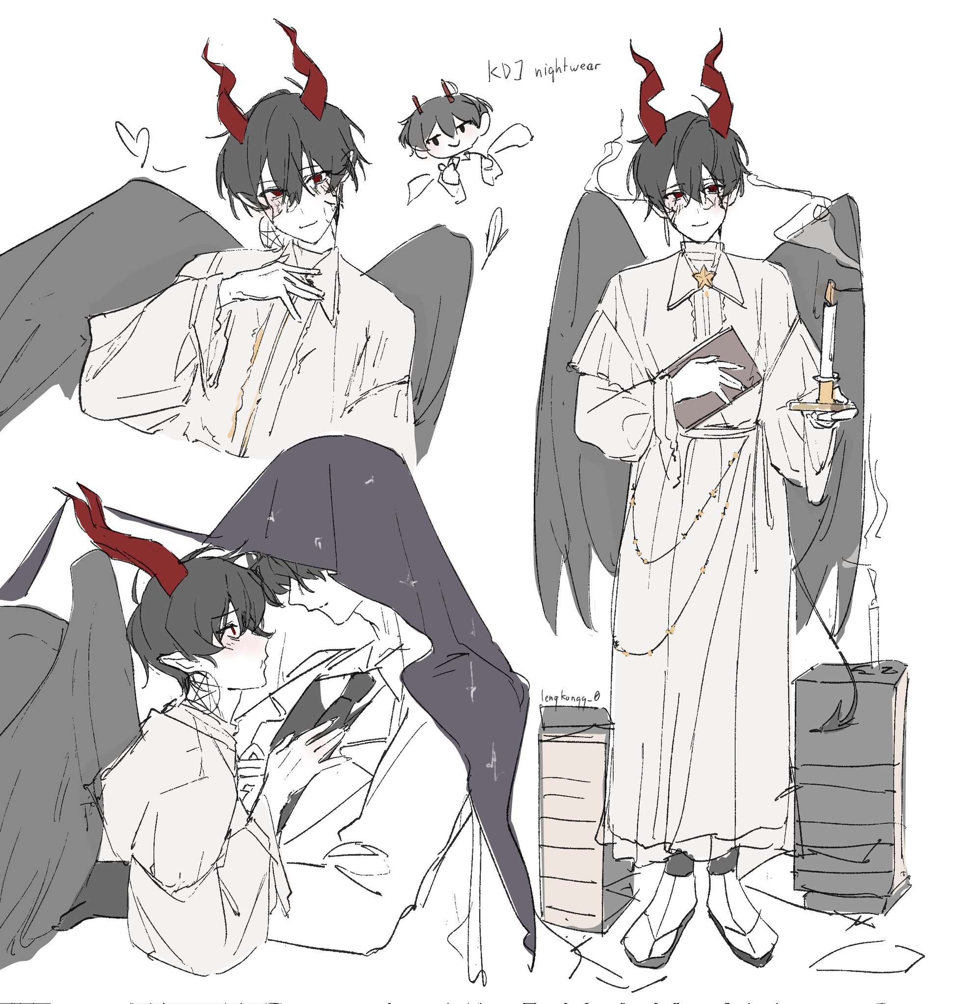 2boys book candlestand cassock clerical_collar cloak demon_horns feathered_wings highres holding holding_book holding_candlestand hood hood_up hooded_cloak horns kim_dokja lengkongg_0 looking_at_another male_focus multiple_boys omniscient_reader's_viewpoint partially_colored secretive_plotter starry_sky_print wings yaoi yoo_joonghyuk