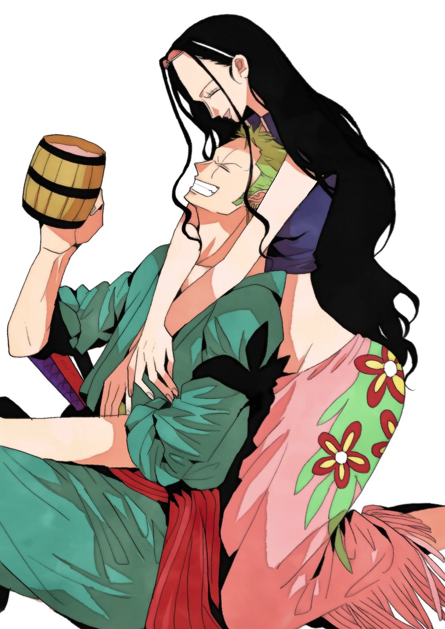 1boy 1girl ^_^ beer_mug clenched_teeth closed_eyes crop_top cup eyewear_on_head green_kimono highres holding holding_cup hug hug_from_behind japanese_clothes kimono long_hair may_snmk mug nico_robin nico_robin_(return_to_sabaody) official_alternate_costume one_piece pink_sarong profile red_sash roronoa_zoro sarong sash scar scar_across_eye scar_on_face short_hair sideburns simple_background smile sword teeth weapon white_background