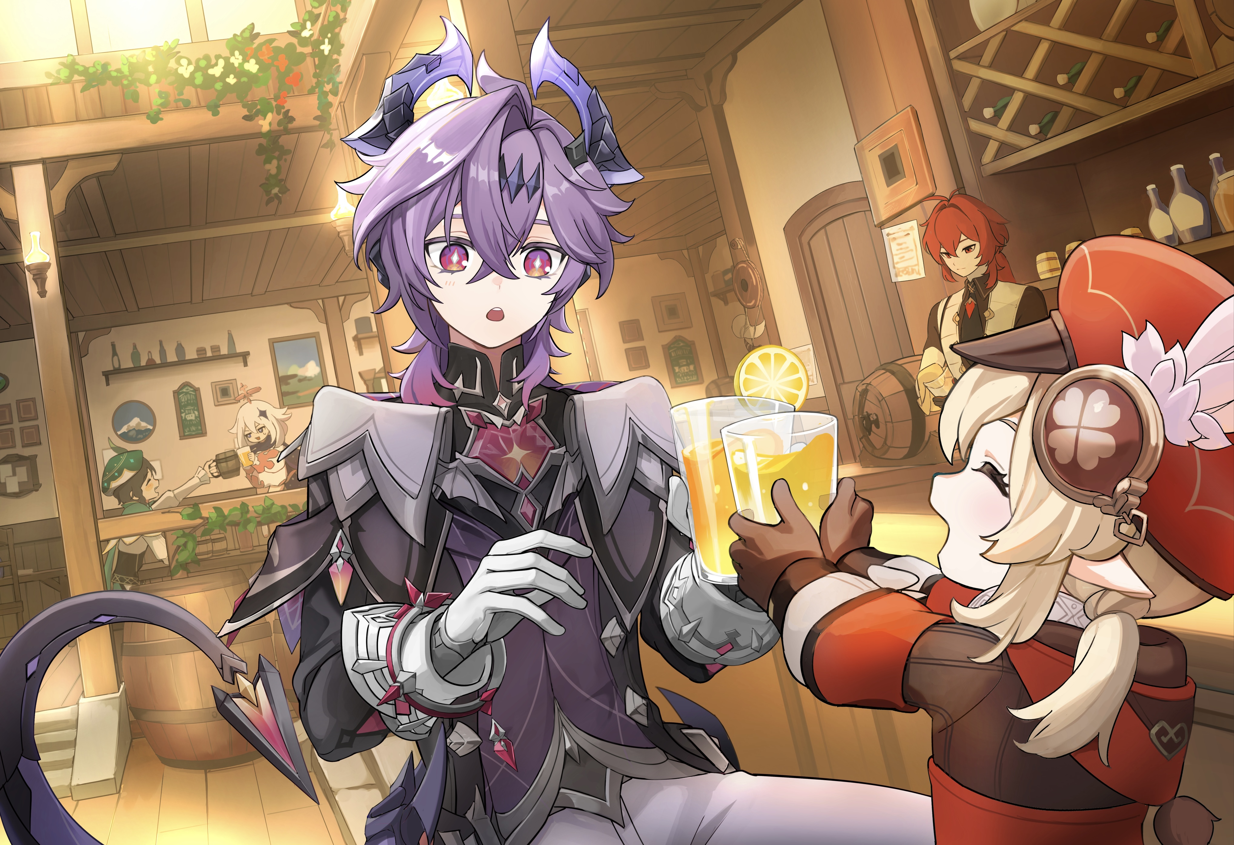 2girls 3boys absurdres alcohol barrel blonde_hair bottle brown_gloves child cleaning cleaning_rag closed_eyes closed_mouth commentary_request counter cup diluc_(genshin_impact) door dragon_boy dragon_horns dragon_tail drinking_glass durin_(genshin_impact) food fruit genshin_impact glasses gloves hat headgear highres holding holding_cup hood hood_down horns in-universe_location klee_(genshin_impact) lemon lemon_slice long_sleeves looking_at_another multiple_boys multiple_girls okkobc open_mouth paimon_(genshin_impact) pointy_ears purple_hair red_hair red_hat short_twintails soda tail tavern twintails venti_(genshin_impact) watermark white_gloves white_hair wine