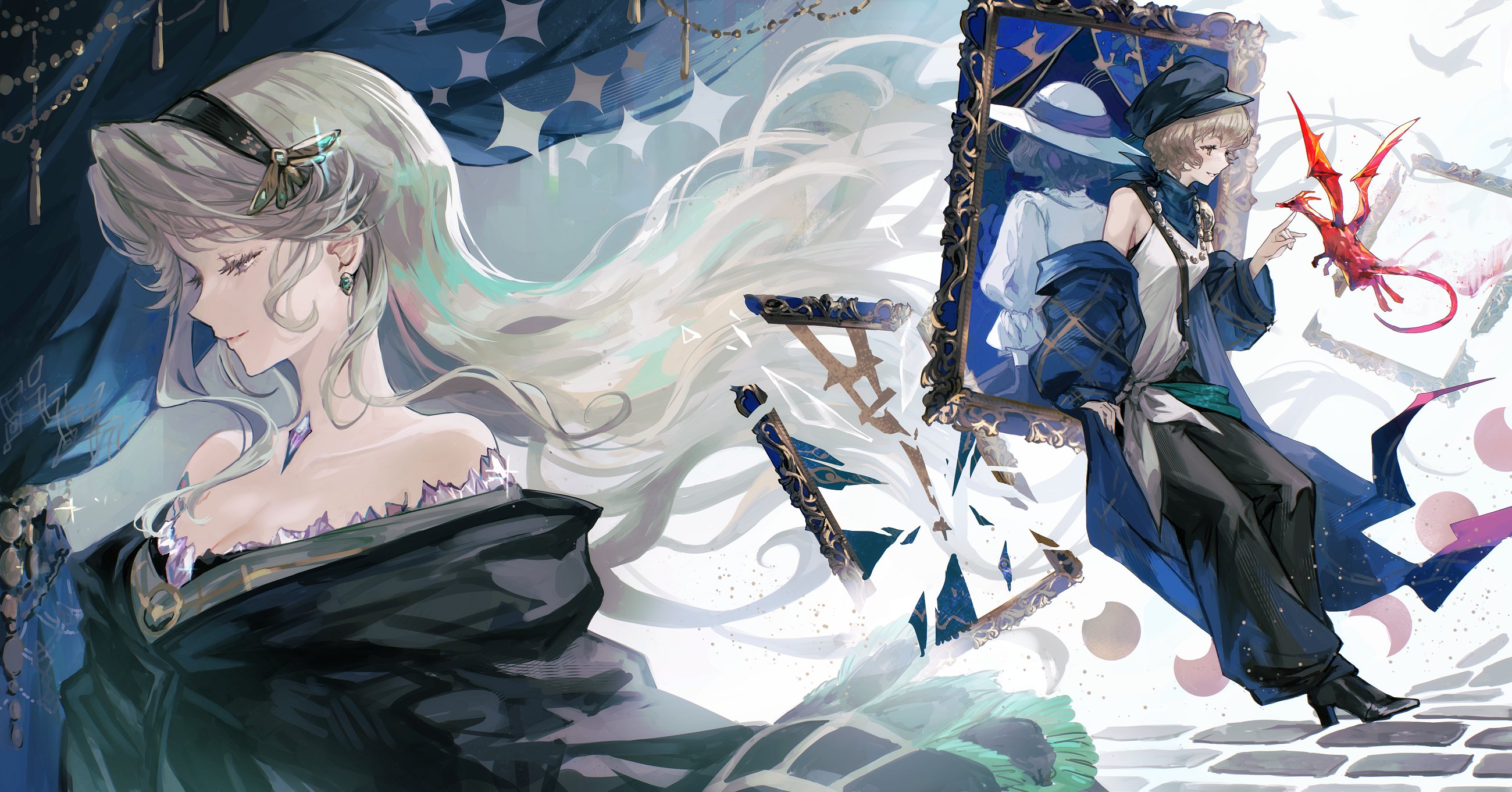 3girls apt bare_shoulders beryl_bouanich black_cloak black_hat black_pants black_shoes blonde_hair blue_coat blue_eyes blue_neckerchief brume_(reverse:1999) cloak coat commentary_request crystal_earrings dragon dragonfly_hair_ornament earrings felicienne_(reverse:1999) from_side grey_hair grin half-closed_eyes hand_up hat highres jewelry long_hair moon_phases multiple_girls neckerchief newsboy_cap off_shoulder pants picture_frame profile reverse:1999 shirt shoes short_hair sitting small_dragon smile sparkle tank_top upper_body white_hat white_shirt white_tank_top yellow_eyes