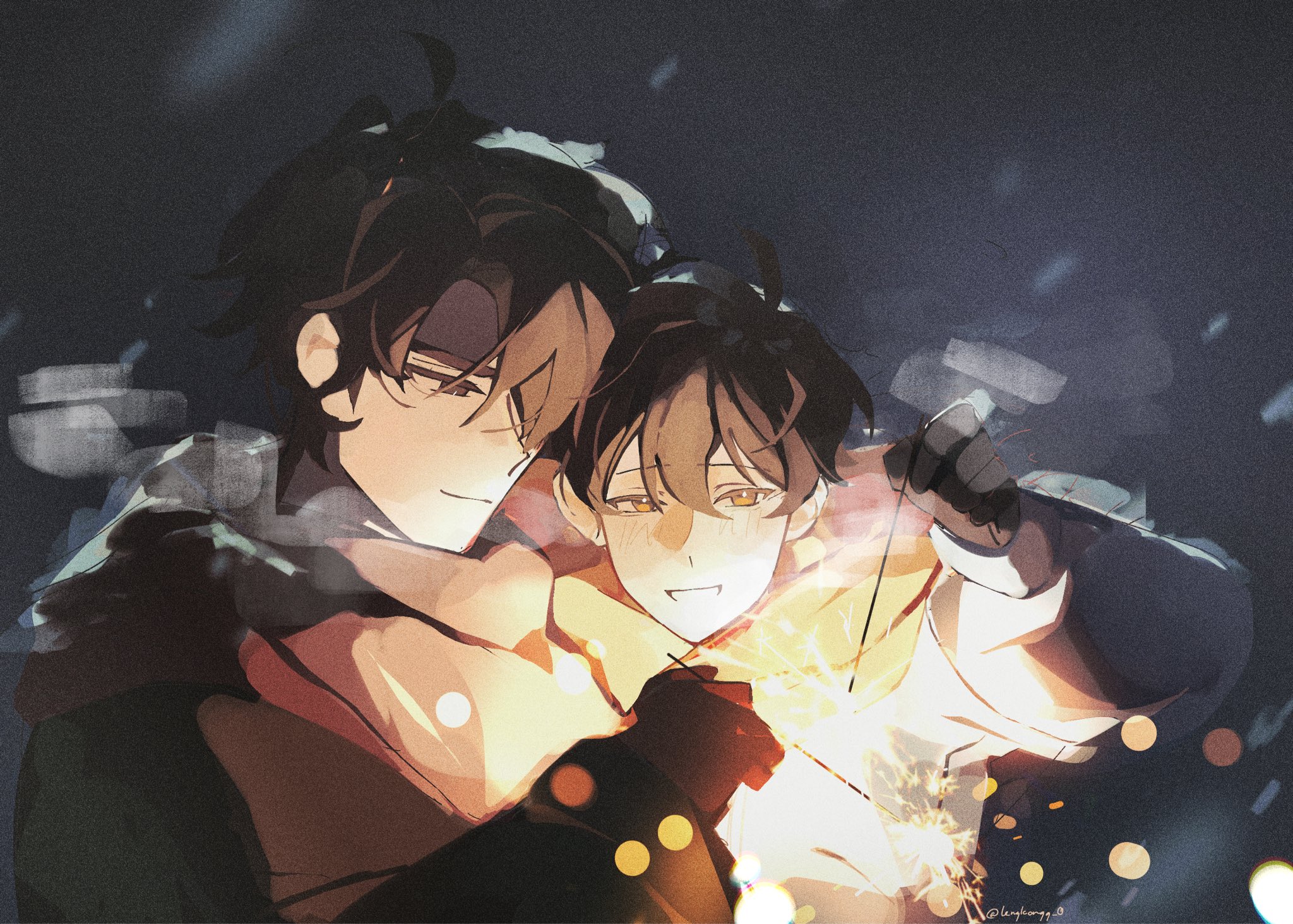 2boys black_eyes black_gloves black_hair breath fireworks gloves glowing grin highres holding holding_fireworks kim_dokja lengkongg_0 light_particles male_focus multiple_boys omniscient_reader's_viewpoint outdoors scarf short_hair smile snowing sparkler sweater upper_body yoo_joonghyuk