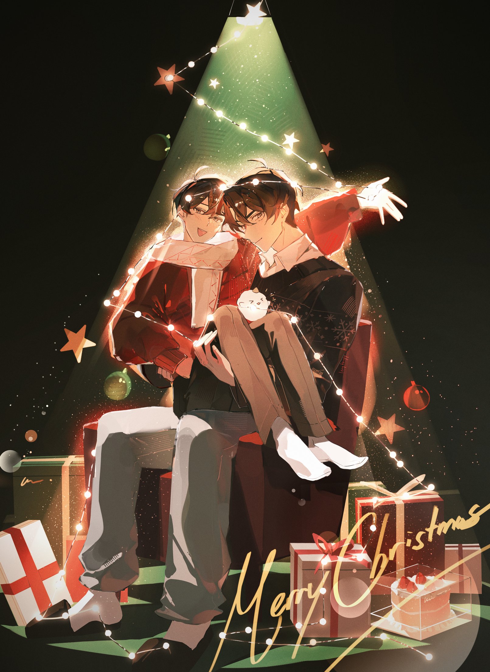 2boys biyoo_(omniscient_reader's_viewpoint) black_hair box chair collared_shirt commentary full_body gift gift_box glowing highres kim_dokja knees_up lengkongg_0 light_particles looking_at_viewer lounge_chair male_focus merry_christmas multiple_boys omniscient_reader's_viewpoint outstretched_arm scarf shirt short_hair sitting sitting_on_lap sitting_on_person socks spotlight sweater untranslatable_commentary vest white_socks yoo_joonghyuk