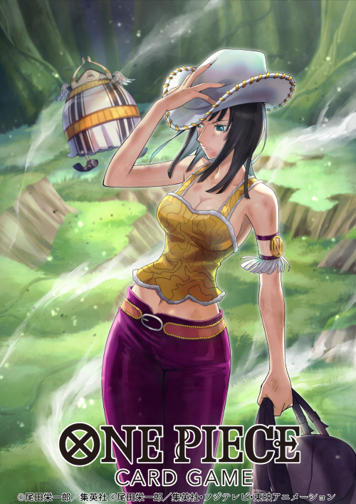 1boy 1girl 2026 armlet bag bare_shoulders black_hair blue_eyes blunt_bangs breasts cleavage commentary_request copyright_name cowboy_hat dress forest hand_on_own_hat hat holding holding_bag jewelry medium_hair midriff nature navel nico_robin nico_robin_(skypiea) official_alternate_costume official_art one_piece one_piece_card_game ori_simo outdoors pants purple_pants skypiea smoke tank_top tree white_hat white_wings wings yama_(one_piece) yellow_tank_top