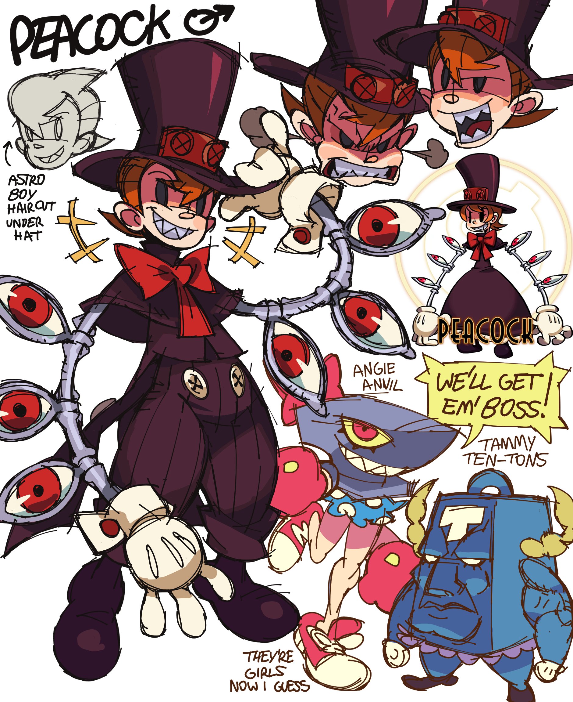 1boy andy_anvil bow bowtie boxing_gloves coattails english_text genderswap genderswap_(ftm) genderswap_(mtf) gloves grin highres large_buttons laughing male_focus mars_symbol multiple_views orange_eyes peacock_(skullgirls) red_bow red_bowtie red_eyes red_ribbon ribbon shoes skullgirls smile sneakers solid_oval_eyes speech_bubble tailcoat the_noodle_(onebadnoodle) tommy_ten-tons white_gloves white_wrist_cuffs wrist_cuffs