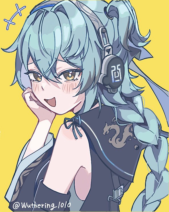 1010_(wuthering1010) 1girl bare_shoulders blue_hair blush braid buling_(wuthering_waves) commentary_request hair_between_eyes hand_up headphones long_hair looking_at_viewer looking_to_the_side open_mouth side_ponytail smile solo turning_head twitter_username upper_body wuthering_waves yellow_background yellow_eyes