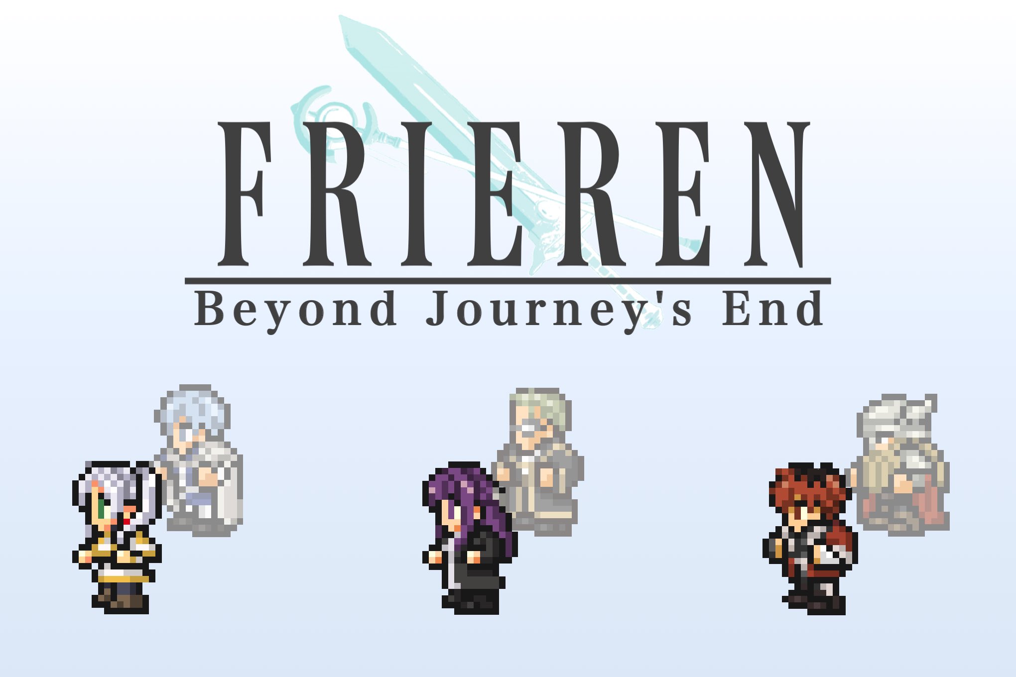 2girls 4boys beard black_coat black_roots blonde_hair blue_eyes blue_hair cloak coat commentary_request copyright_name dress eisen_(sousou_no_frieren) elf facial_hair fake_horns fern_(sousou_no_frieren) frieren glasses gold_trim green_eyes grey_hair hair_over_shoulder heiter helmet highres himmel_(sousou_no_frieren) horned_helmet horns jacket long_hair mashimaro_doter multiple_boys multiple_girls parted_bangs pixel_art pointy_ears purple_eyes purple_hair red_coat red_eyes red_hair shirt short_hair sidelocks sousou_no_frieren sprite_art stark_(sousou_no_frieren) twintails white_cloak white_dress white_jacket white_shirt