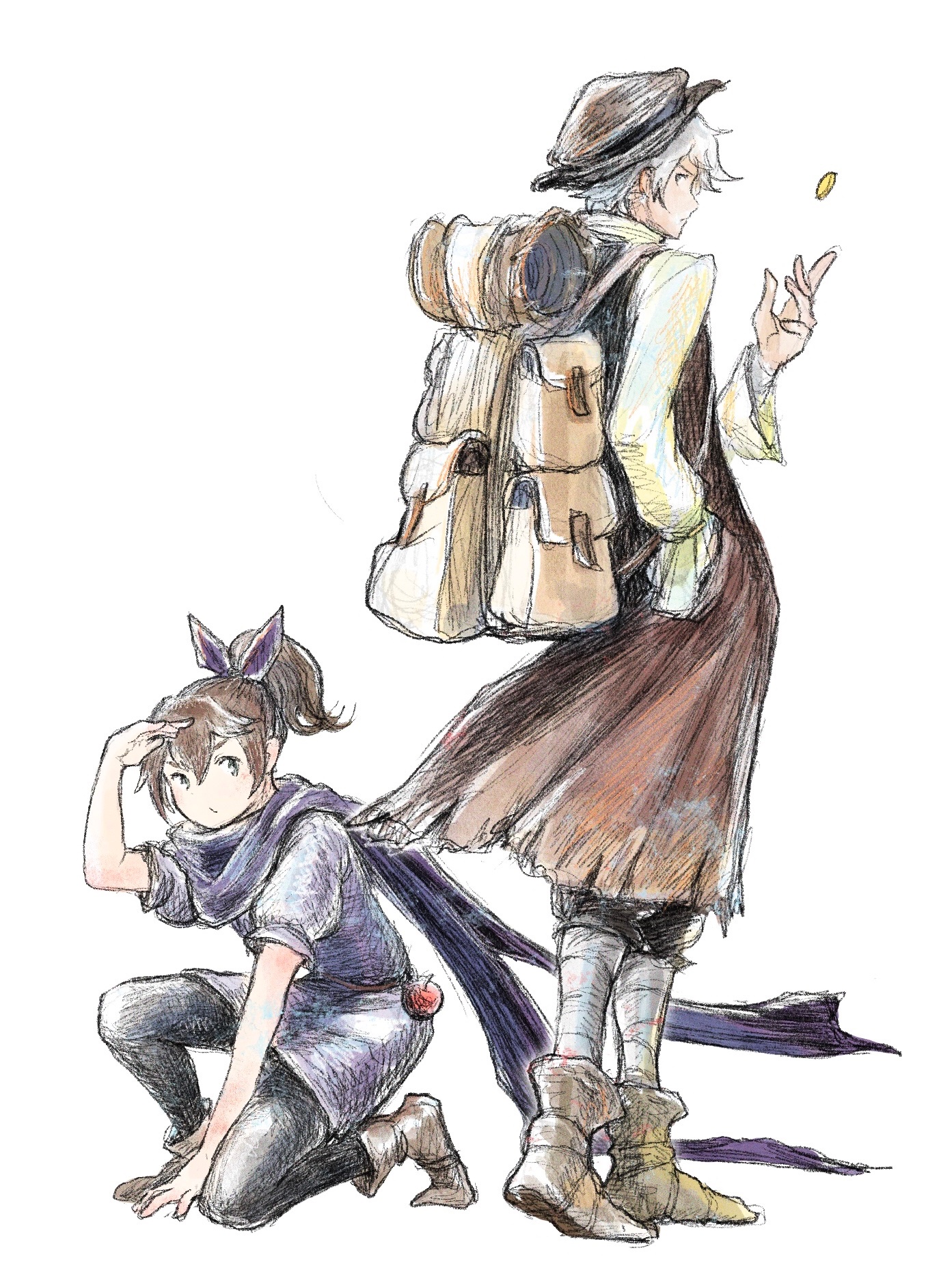 1boy 1girl backpack bag black_pants boots brown_boots brown_hair brown_hat coin commentary_request cosplay costume_switch hand_in_pocket hat high_ponytail highres hiking_backpack looking_back octopath_traveler octopath_traveler_i on_one_knee pants ponytail purple_scarf qqqqqli scarf simple_background therion_(octopath_traveler) tossing tressa_colzione v-shaped_eyebrows white_background
