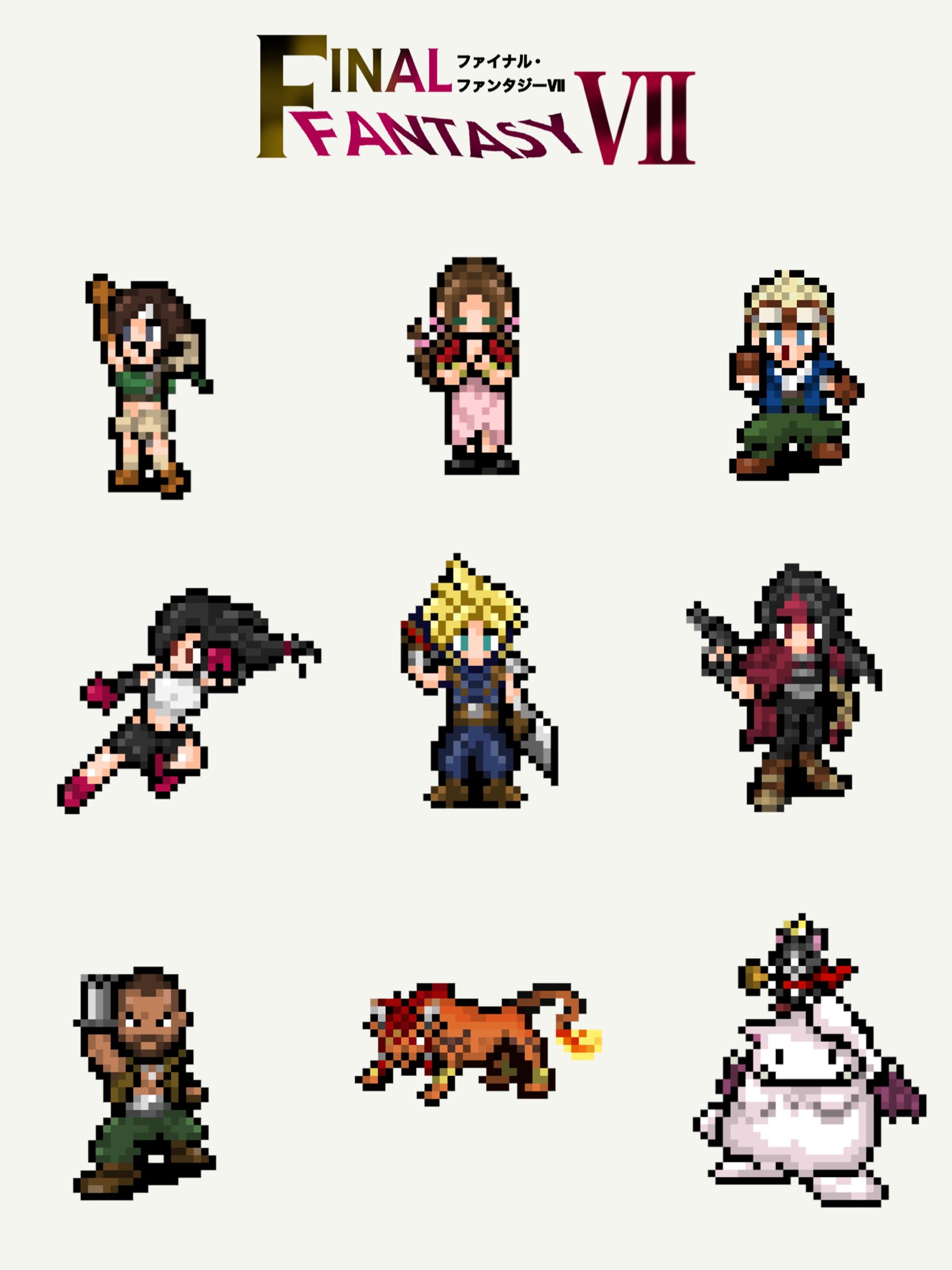 3girls 4boys aerith_gainsborough animal animal_on_head aqua_eyes barret_wallace beard belt black_pants black_skirt blonde_hair blue_jacket blue_pants blue_shirt boots brown_belt brown_boots brown_eyes brown_gloves brown_hair buster_sword cait_sith_(final_fantasy) cape cat cat_on_head cid_highwind cloak closed_eyes cloud_strife commentary_request copyright_name crop_top crown dark-skinned_male dark_skin dress facial_hair fangs fangs_out fighting_stance final_fantasy final_fantasy_vii fire flame-tipped_tail full_body gloves goggles goggles_on_head green_eyes green_pants green_shirt grey_eyes grey_shorts gun hair_tie hairband hand_up handgun highres holding holding_gun holding_megaphone holding_weapon jacket kicking long_dress long_hair low-tied_long_hair mashimaro_doter megaphone mini_crown miniskirt moogle multiple_boys multiple_girls on_head open_mouth orange_shorts own_hands_together pants parted_bangs pink_dress pink_ribbon pixel_art prosthetic_weapon red_boots red_cape red_cloak red_eyes red_gloves red_hairband red_jacket red_xiii ribbon shirt short_hair shorts skirt smile spiked_hair sprite_art suspenders sword sword_on_back tail tifa_lockhart vincent_valentine weapon weapon_on_back white_background white_shirt yuffie_kisaragi