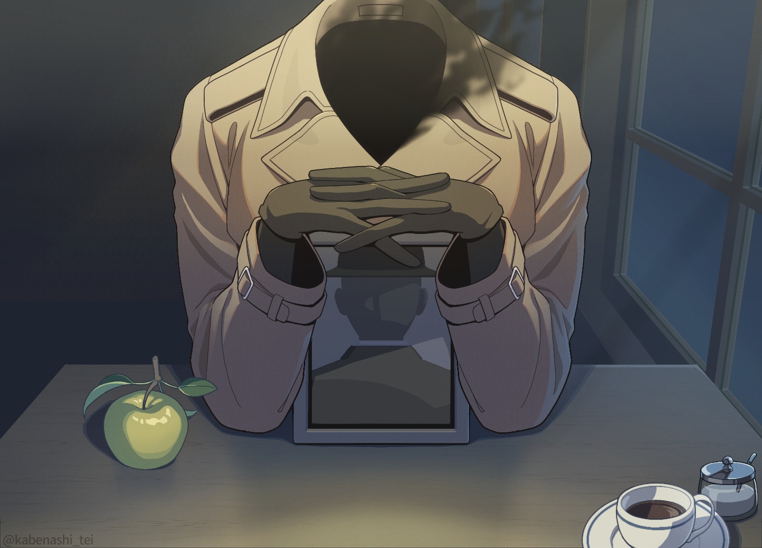 2boys apple artist_name black_gloves black_smoke blue_archive brown_coat coat commentary_request cup drink elbows_on_table food fruit gloves golconda_&_decalcomania_(blue_archive) green_apple headless indoors interlocked_fingers male_focus minokurage multiple_boys own_hands_clasped own_hands_together portrait_(object) pov_across_table saucer sugar_bowl table teacup twitter_username window