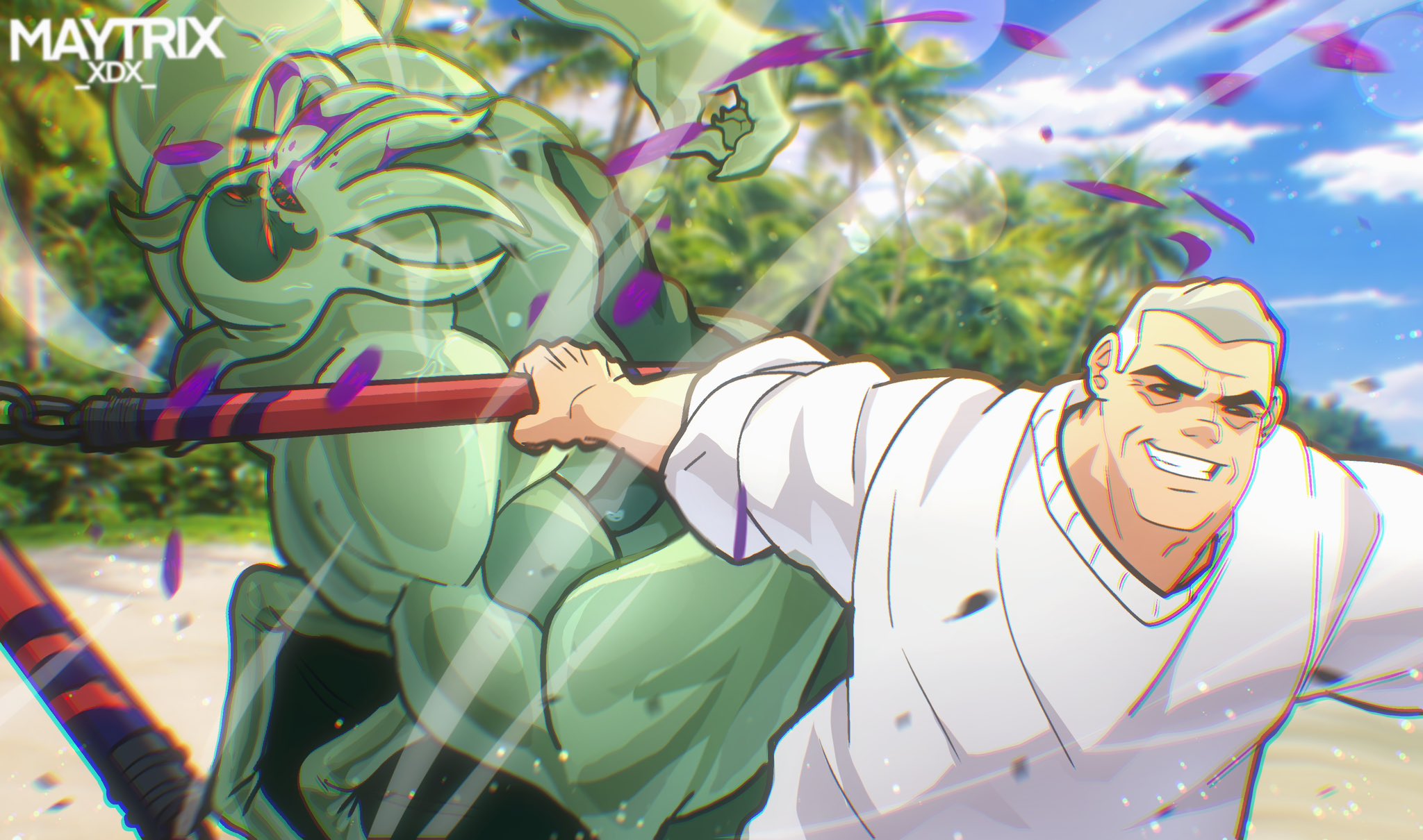 ben_10 black_eyes dagon_(jujutsu_kaisen) fushiguro_toji grey_hair highres holding holding_weapon jujutsu_kaisen max_tennyson maytrixxdx monster octopus old outdoors red_eyes smile sweater vilgax weapon white_hair white_sweater