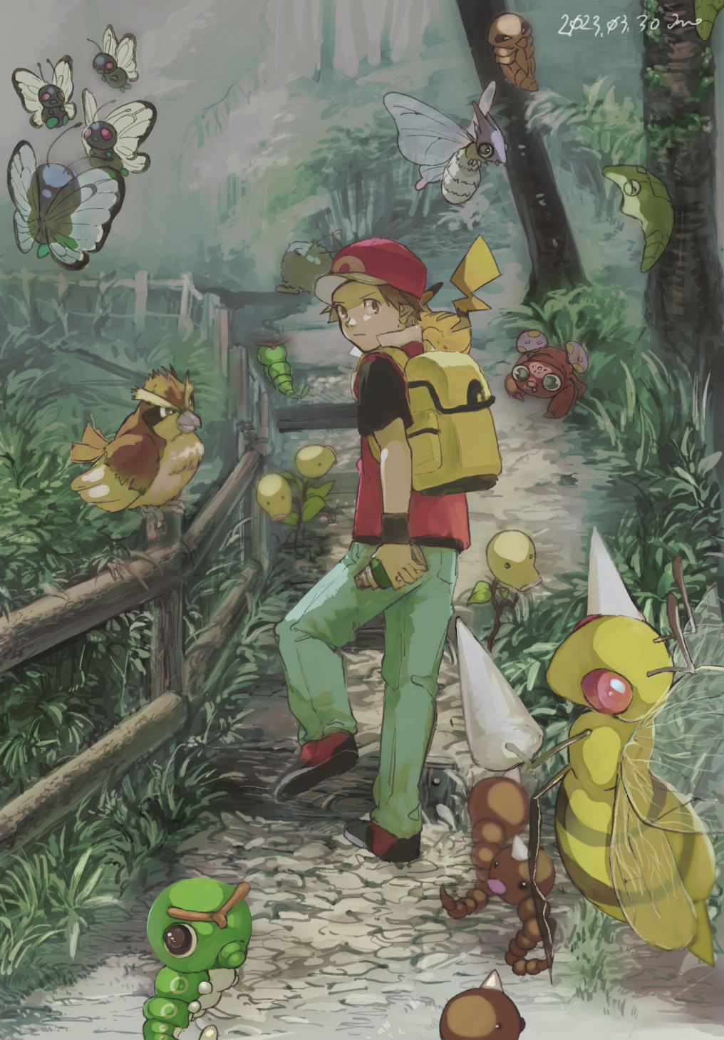 1boy backpack bag beedrill bellsprout black_shirt brown_hair butterfree caterpie closed_mouth commentary_request fence gen_1_pokemon hat highres holding ino_(zcyh3274) kakuna male_focus metapod nintendo outdoors pants paras pidgey pikachu pokemon pokemon_(creature) pokemon_firered_and_leafgreen red_(pokemon) red_hat shirt shoes short_hair short_sleeves standing t-shirt tree venomoth vest weedle wristband yellow_bag
