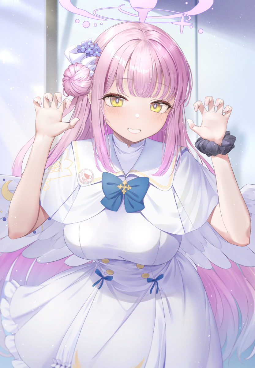 1girl angel_wings black_scrunchie blue_archive blue_bow blush bow breasts buttons claw_pose commentary_request double-breasted dress feathered_wings flower hair_bun hair_flower hair_ornament halo high-waist_skirt highres large_breasts long_hair looking_at_viewer low_wings mika_(blue_archive) mizuya_nao petals pink_hair pink_halo scrunchie single_hair_bun single_side_bun skirt smile solo teeth upper_body very_long_hair white_dress white_overskirt white_wings wings wrist_scrunchie yellow_eyes