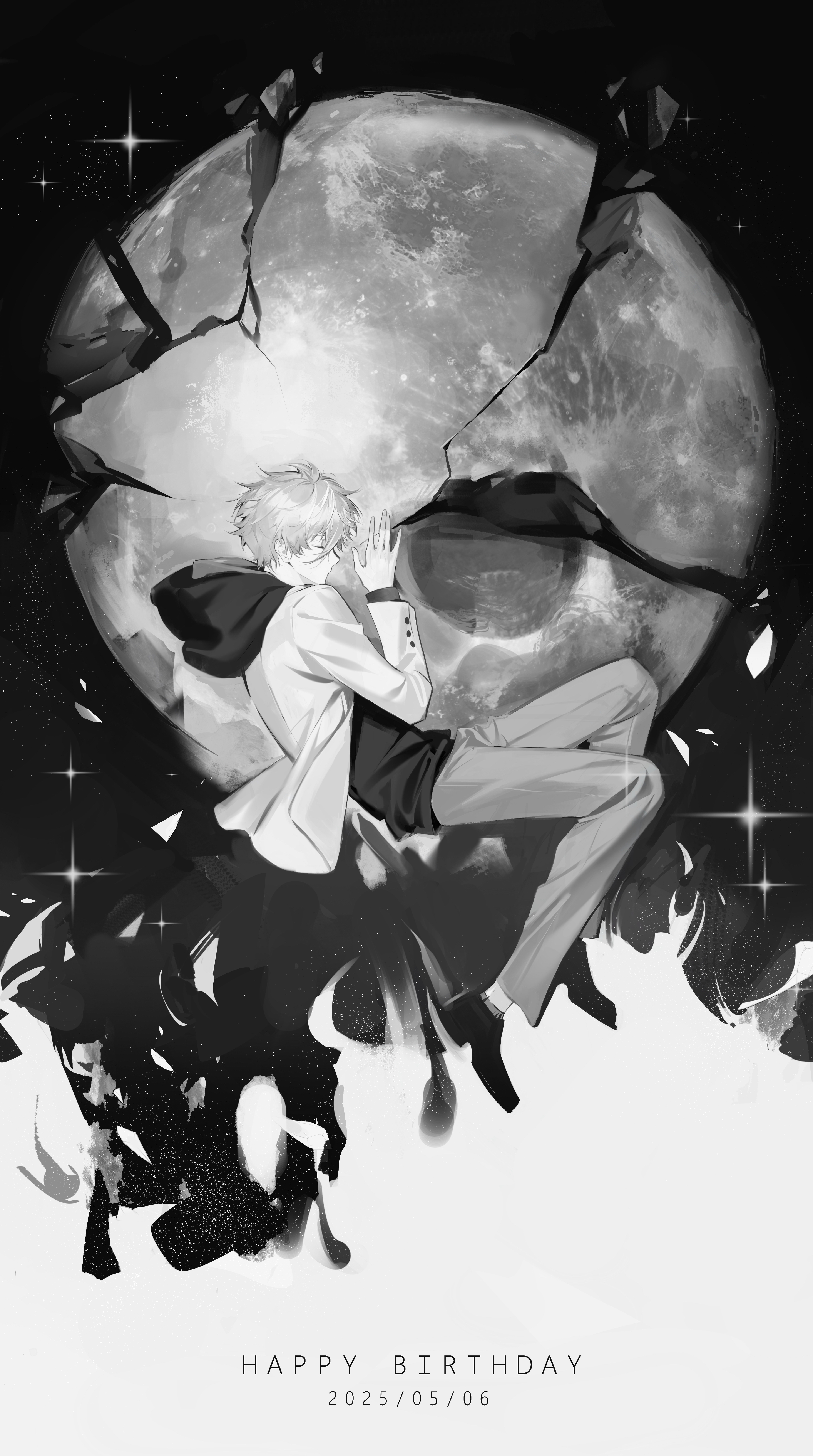 1boy absurdres blue_lock broken_moon closed_eyes closed_mouth commentary fire full_body greyscale highres hood hood_down hoodie jacket jacket_over_hoodie male_focus monochrome moon nagi_seishirou nanqingyi open_clothes open_jacket pants shoes short_hair socks solo sparkle star_(sky)