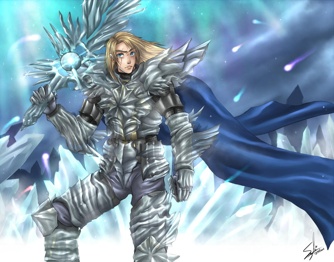 1boy armor aurora blonde_hair blue_cape blue_eyes cape clawed_gauntlets colored_pencil_(medium) commentary cowboy_shot crystal crystal_armor crystal_sword english_commentary glowing glowing_sword glowing_weapon greatsword holding holding_sword holding_weapon light_particles light_rays long_hair male_focus night scar scar_across_eye scar_on_face shoulder_armor siegfried_schtauffen signature soul_calibur soul_calibur_(crystal_greatsword) soulcalibur soulcalibur_iv sword syahilla traditional_media weapon