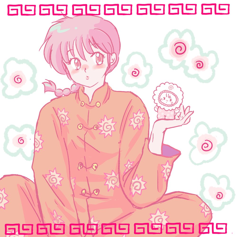 1girl blush braid cameo closed_mouth commentary_request food fuwariko holding kamaboko lil_ala_mode mousse_(lil_ala_mode) narutomaki pajamas pink_eyes pink_hair pink_lips ranma-chan ranma_1/2 single_braid solo