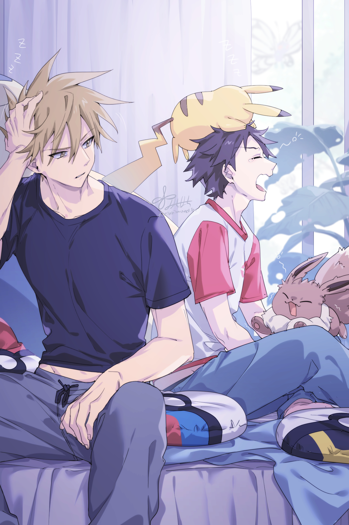 2boys 2girls 88_(einnimnech) black_shirt blue_oak blue_pants brown_eyes brown_hair closed_eyes collarbone commentary_request eevee gen_1_pokemon great_ball grey_pants highres indoors male_focus multiple_boys multiple_girls nintendo on_bed on_head open_mouth pants pikachu pillow plant poke_ball poke_ball_(basic) pokemon pokemon_(creature) pokemon_on_head pokemon_sun_and_moon potted_plant red_(pokemon) shirt short_hair short_sleeves sitting spiked_hair squeans ultra_ball waking_up white_shirt yawning