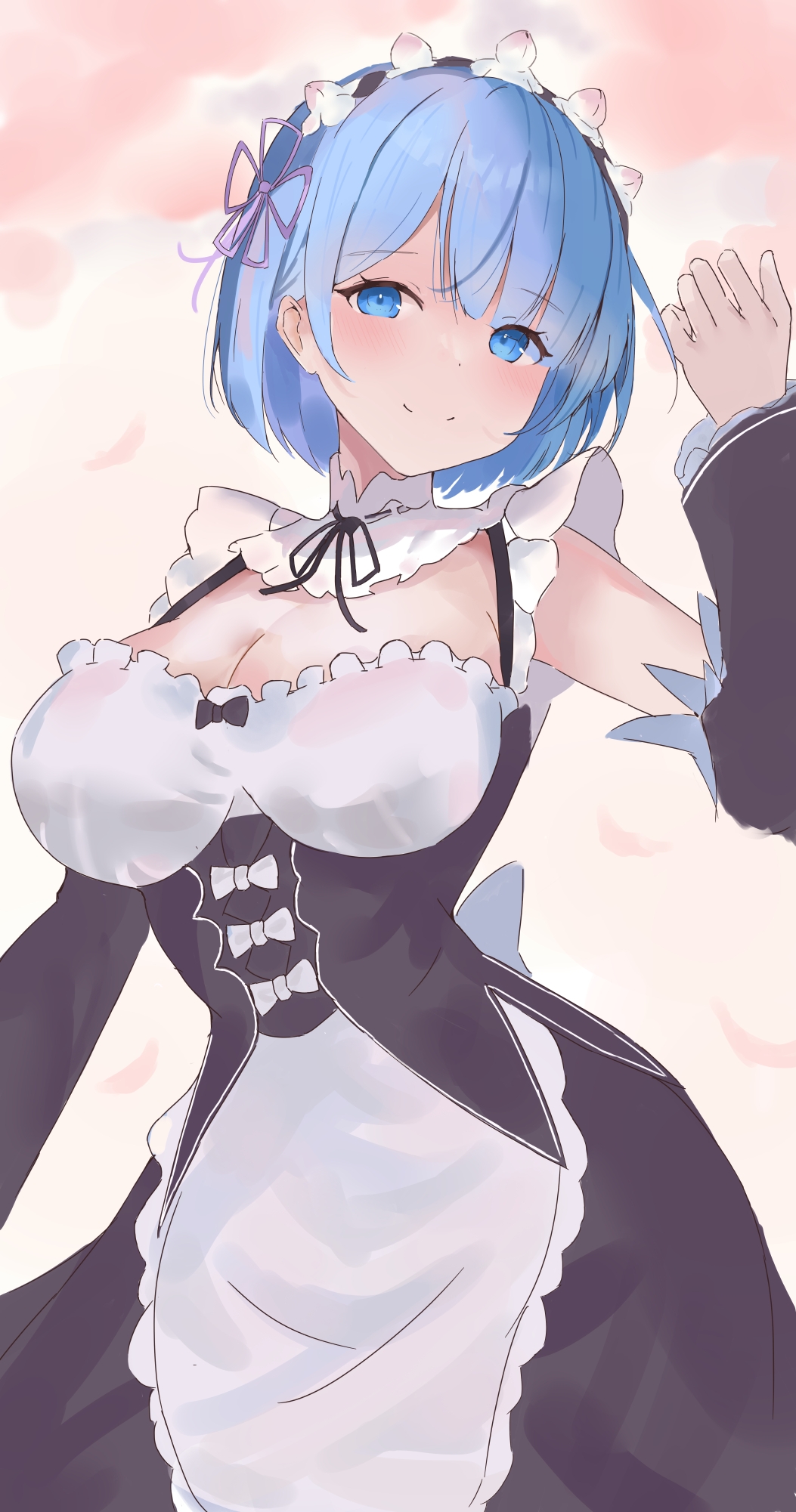 1girl apron black_dress blue_eyes blue_hair breasts cleavage closed_mouth commentary_request cowboy_shot detached_sleeves dress frilled_dress frills hair_over_one_eye hair_ribbon hand_up highres large_breasts looking_at_viewer maid maid_headdress parted_bangs purple_ribbon re:zero_kara_hajimeru_isekai_seikatsu rem_(re:zero) ribbon roswaal_mansion_maid_uniform short_hair sisanng smile solo waist_apron white_apron