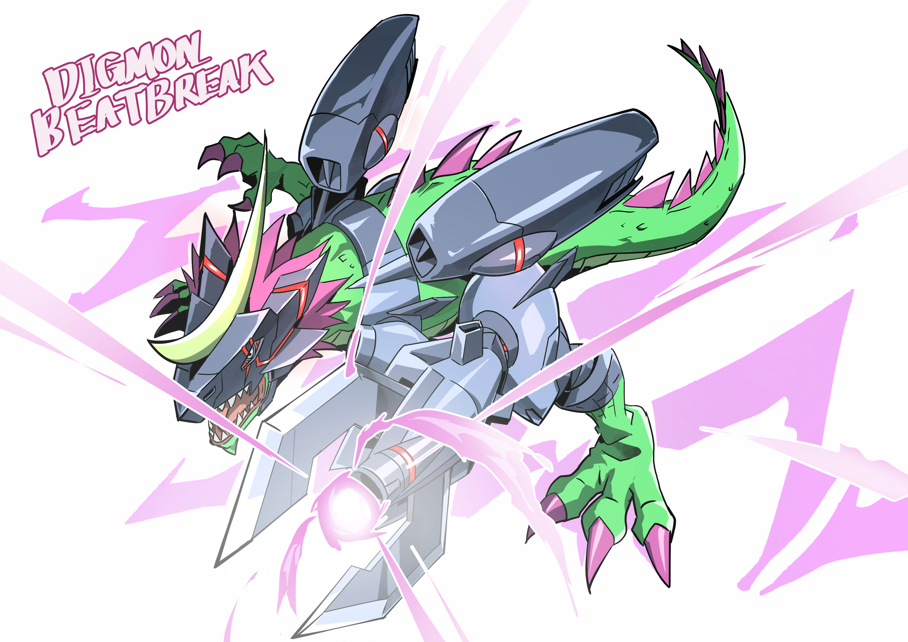 arm_cannon claw_(weapon) commentary_request copyright_name crescent cyborg digimon digimon_(creature) digimon_beatbreak dk_(13855103534) full_body helmet highres lizard mechanical_arms monarchlizamon powering_up simple_background single_mechanical_arm vernier_thrusters weapon white_background