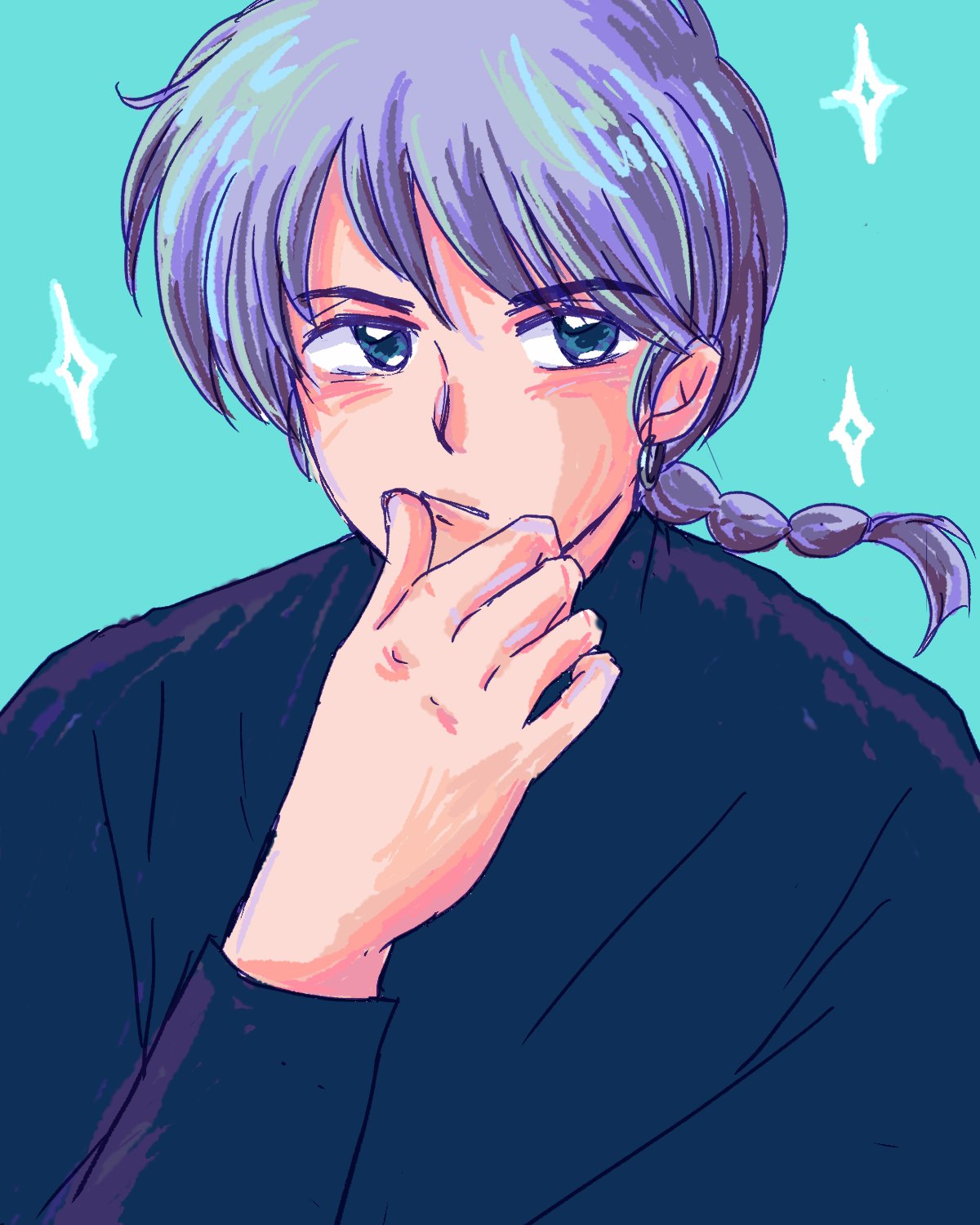 1boy black_shirt blue_background blue_eyes blue_hair braid closed_mouth commentary_request fuwariko hand_on_own_chin highres male_focus ranma_1/2 saotome_ranma shirt single_braid solo upper_body