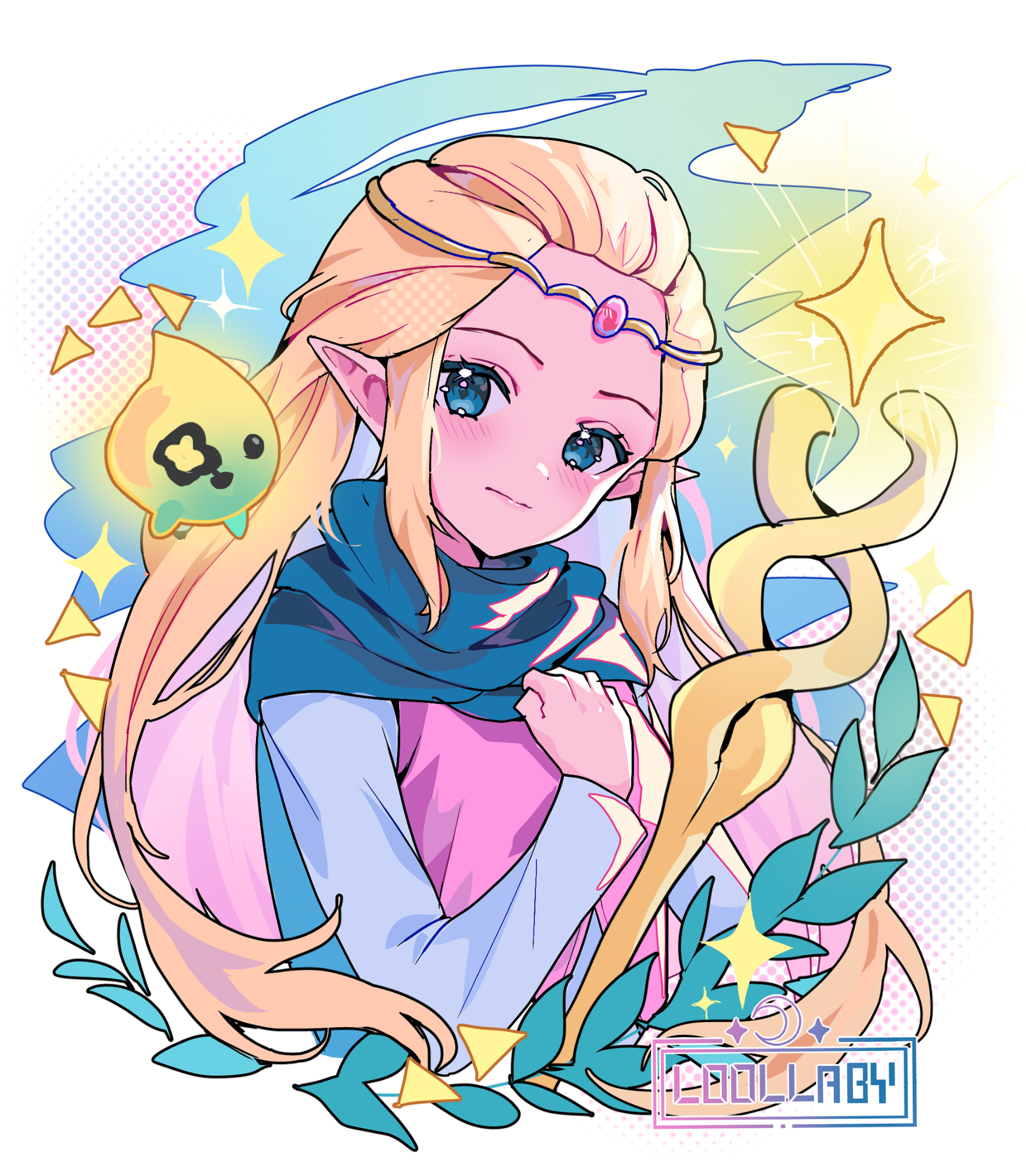 1girl artist_name blonde_hair blue_cloak blue_eyes blush circlet cloak closed_mouth commentary hand_on_own_chest highres l00llaby long_hair nintendo pink_shirt pointy_ears princess_zelda shirt sidelocks sketch staff the_legend_of_zelda the_legend_of_zelda:_echoes_of_wisdom tri_(zelda) upper_body white_shirt