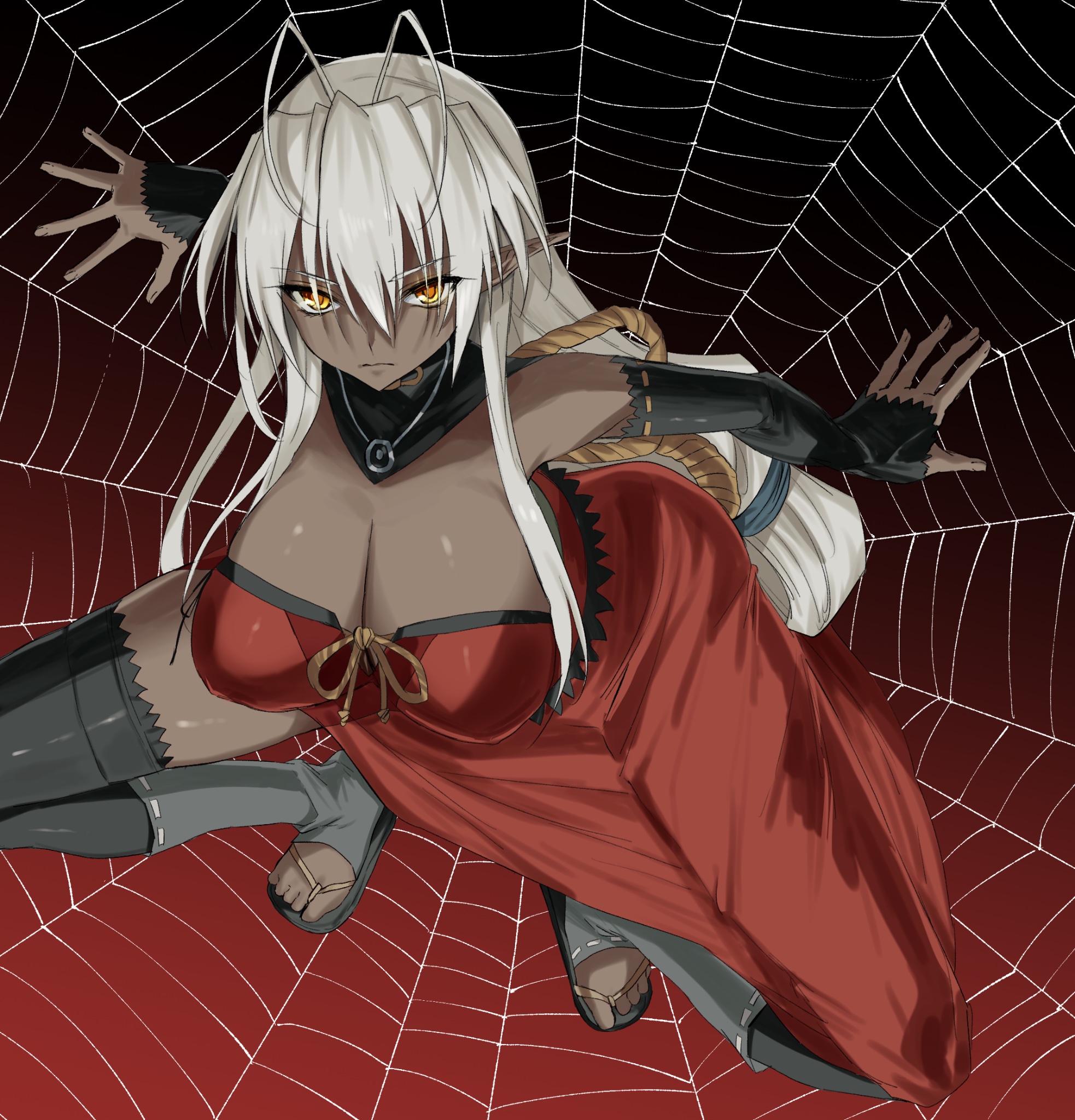 1girl antenna_hair arms_behind_back back_bow black_leggings black_sleeves bow breasts cleavage dark-skinned_female dark_elf dark_skin detached_sleeves dress elf hair_intakes highres jewelry kasukasugom1 large_breasts leggings long_hair necklace pointy_ears red_dress sandals sansei_muramasa silk silver_necklace soukou_akki_muramasa spider_web strapless strapless_dress white_hair yellow_eyes