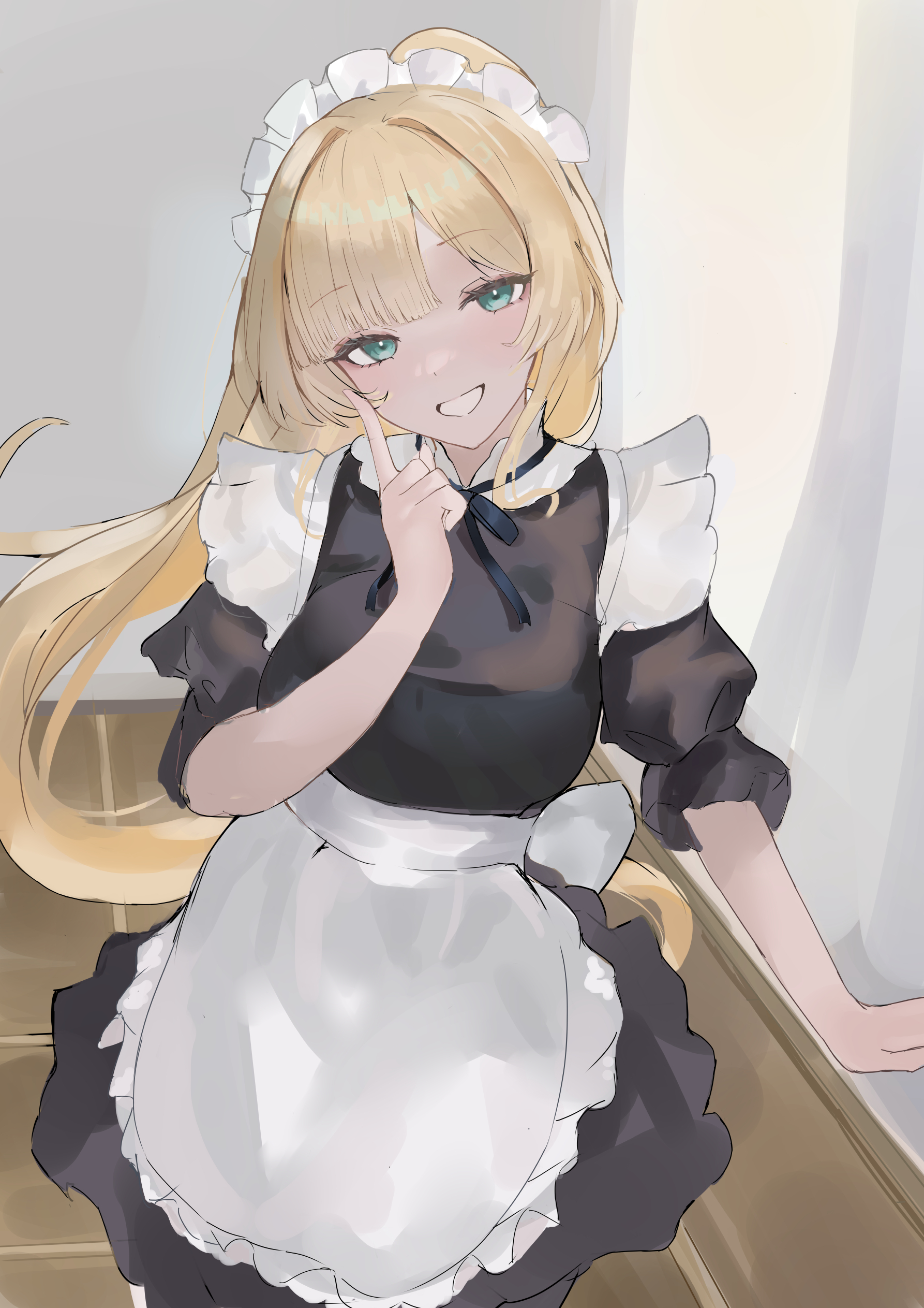 1girl absurdres apron black_dress blue_eyes breasts commentary_request cowboy_shot dress frilled_apron frills hand_up highres index_finger_raised long_hair looking_at_viewer maid maid_headdress medium_breasts open_mouth original parted_bangs puffy_short_sleeves puffy_sleeves short_sleeves sisanng smile solo waist_apron white_apron
