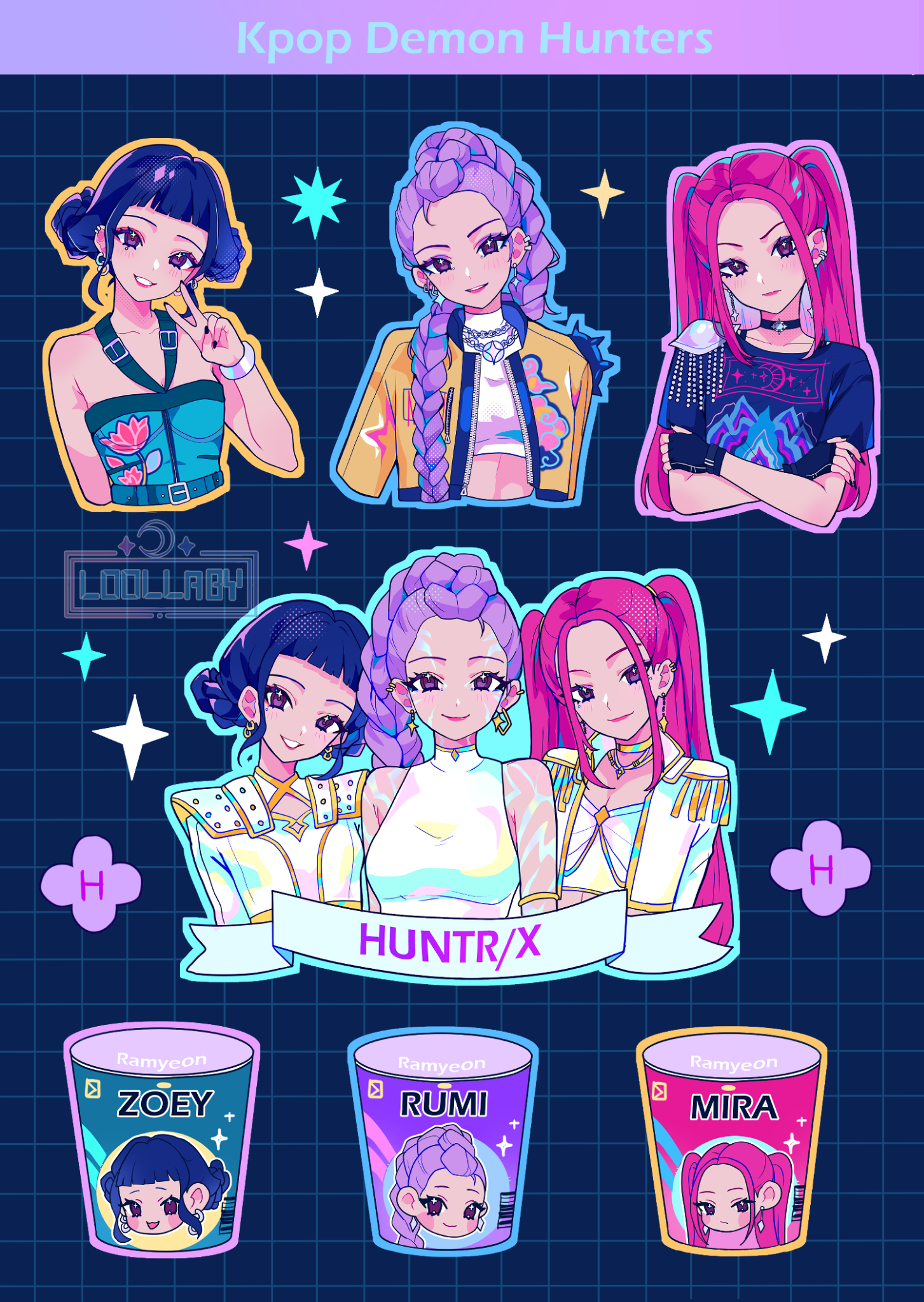 3girls aqua_shirt artist_name bangle bare_shoulders black_choker black_gloves black_nails blunt_bangs blush bracelet braid breasts brown_eyes character_name choker cleavage closed_mouth cropped_jacket crossed_arms double_bun earrings epaulettes fingerless_gloves gloves gold_earrings gold_trim grid_background hair_bun hair_over_shoulder half_updo halter_shirt halterneck highres instant_cup_noodles instant_noodles jacket jewelry kpop_demon_hunters long_hair luna_(l000llaby) medium_breasts midriff mira_(kpop_demon_hunters) multiple_girls nail_polish parted_bangs parted_lips pink_hair police print_shirt purple_hair rumi_(kpop_demon_hunters) shirt short_bangs shoulder_spikes single_braid single_shoulder_pad smile spikes twintails upper_body v white_jacket white_shirt yellow_jacket zoey_(kpop_demon_hunters)