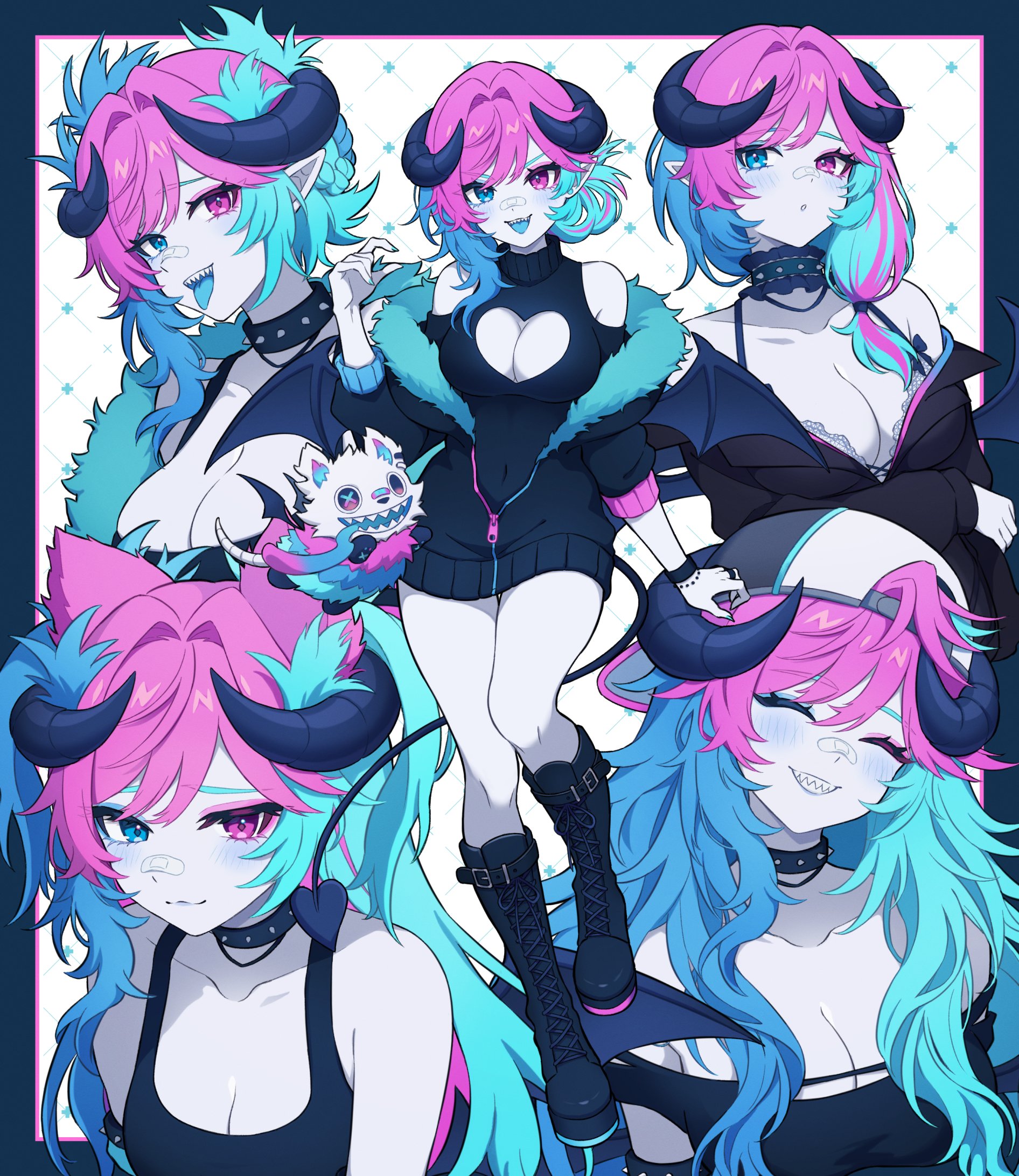 1girl animal_ears backwards_hat bandaid bandaid_on_face bandaid_on_nose bare_shoulders blue_eyes blue_hair blue_tongue blush boots bra breasts cat_ears cleavage closed_eyes clothing_cutout collar colored_tongue demon_girl demon_horns demon_tail demon_wings dress fream_(vtuber) hat heart_cutout heterochromia highres horns indie_virtual_youtuber jewelry lace lace-trimmed_bra lace_trim large_breasts long_hair m1stm1 messy_hair multicolored_hair pink_hair pointy_ears ring sharp_teeth side_ponytail simple_background smile spiked_collar spikes tail teeth thighs tongue tongue_out underwear virtual_youtuber wings