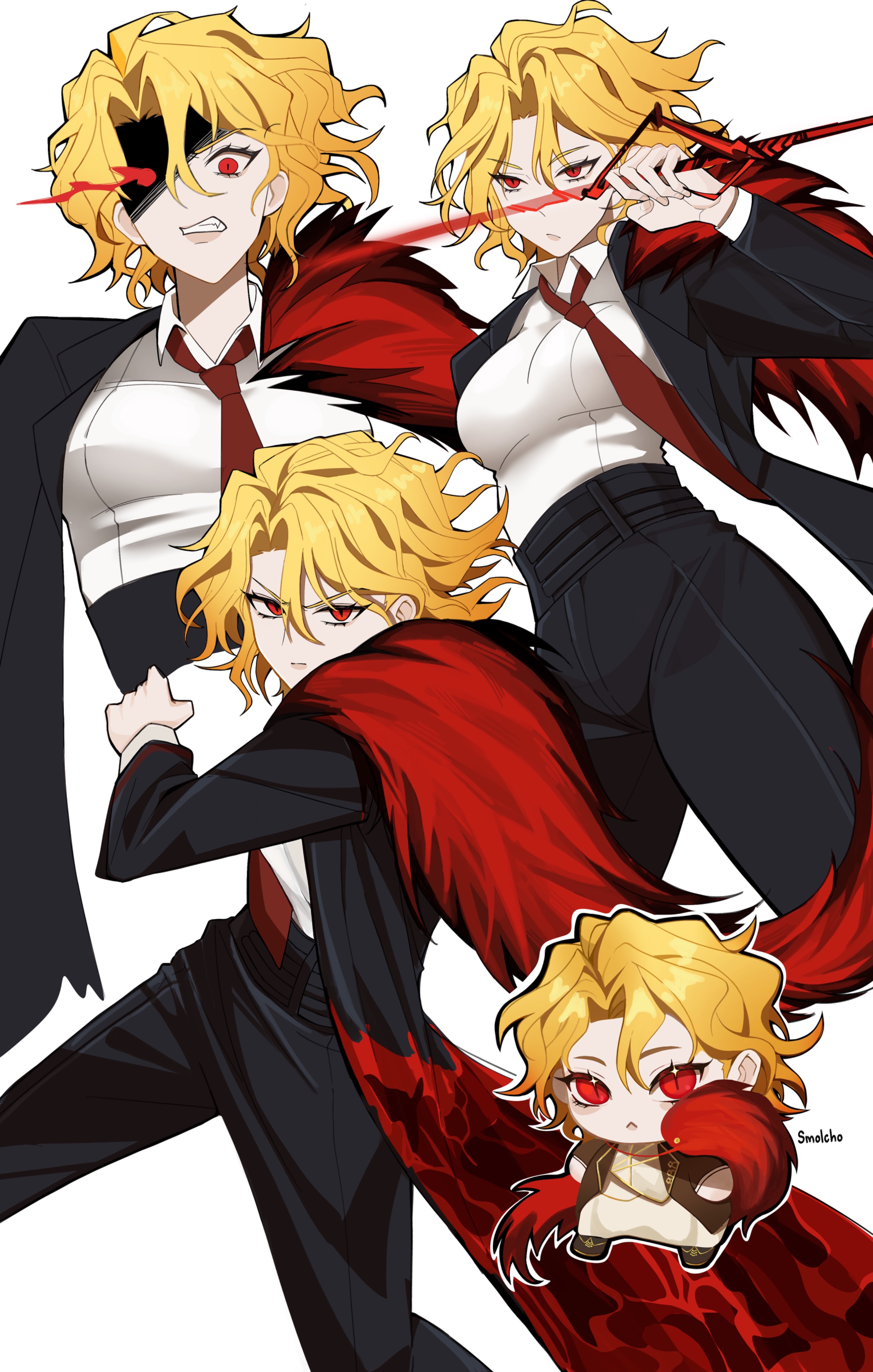 1girl absurdres black_coat blonde_hair breasts chibi coat collared_shirt don_quixote_(project_moon) feathers highres holding holding_weapon jacket lance lilsumashhh limbus_company long_sleeves necktie pants parted_bangs polearm project_moon red_eyes red_feathers red_fur red_necktie sancho_(project_moon) shirt short_hair simple_background weapon white_background white_shirt