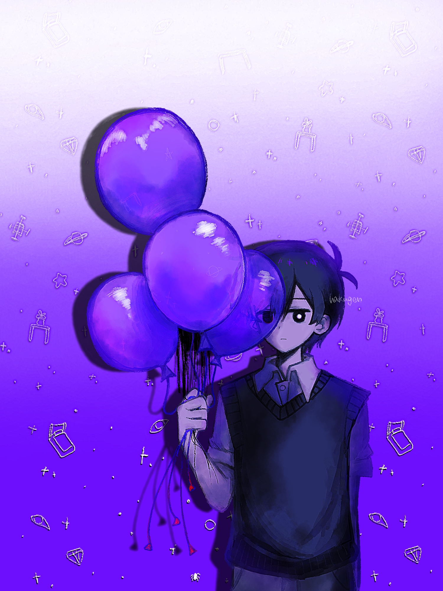 1boy antenna_hair arm_at_side balloon black_eyes black_hair black_sweater_vest closed_mouth collared_shirt double-parted_bangs gradient_background hair_between_eyes hakugen0720 highres holding holding_balloon looking_at_viewer male_focus omori purple_background shirt short_hair solo sunny_(omori) sweater_vest white_shirt