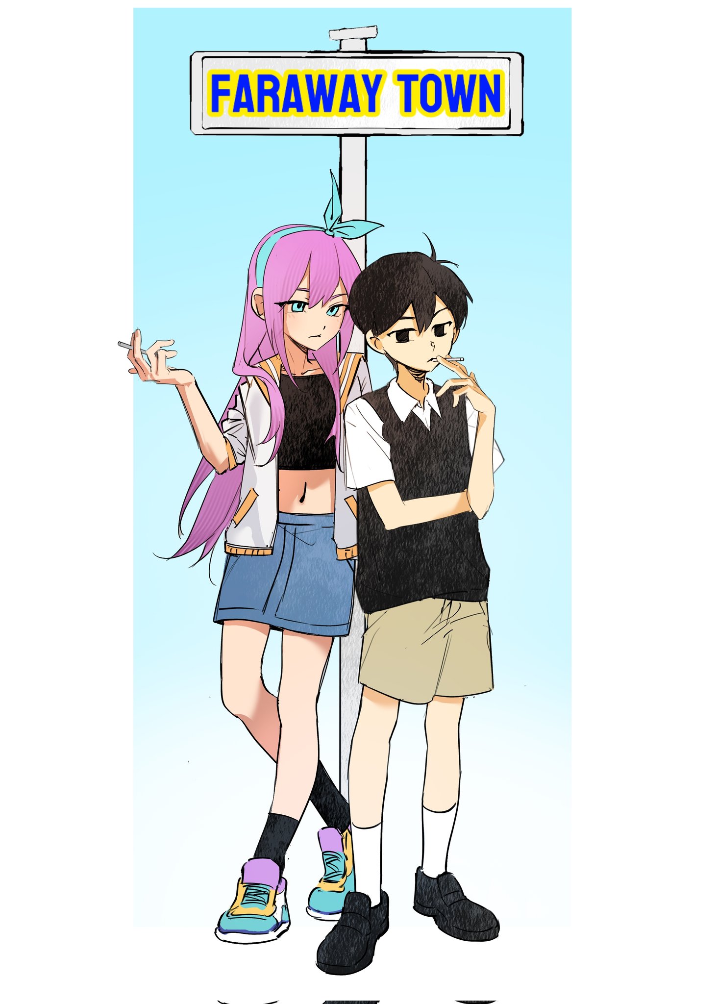 1boy 1girl aubrey_(faraway)_(omori) aubrey_(omori) black_shoes black_socks black_sweater_vest blue_eyes blue_hairband blue_skirt brown_shorts collarbone collared_shirt commentary corrupted_twitter_file crop_top denim denim_skirt double-parted_bangs english_commentary english_text hair_between_eyes hairband highres jacket long_hair omori pink_hair shirt shoes short-sleeved_jacket short_sleeves shorts sidelocks skirt sneakers socks sunny_(omori) sweater_vest white_jacket white_shirt white_socks ze_yi8473