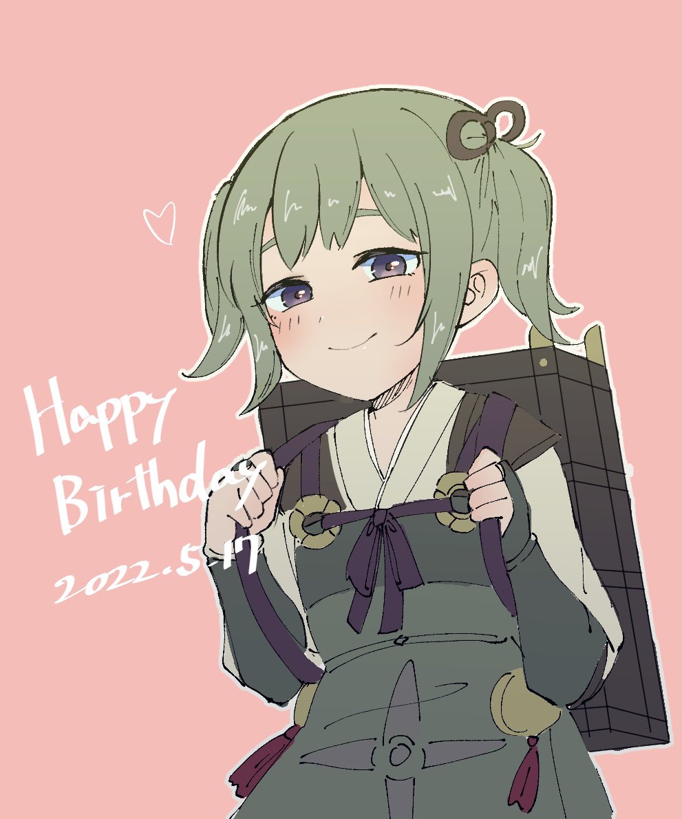 1girl closed_mouth dated fire_emblem fire_emblem_fates green_hair happy happy_birthday japanese_clothes looking_at_viewer midori_(fire_emblem) nintendo pink_background smile solo twintails twqk6 upper_body