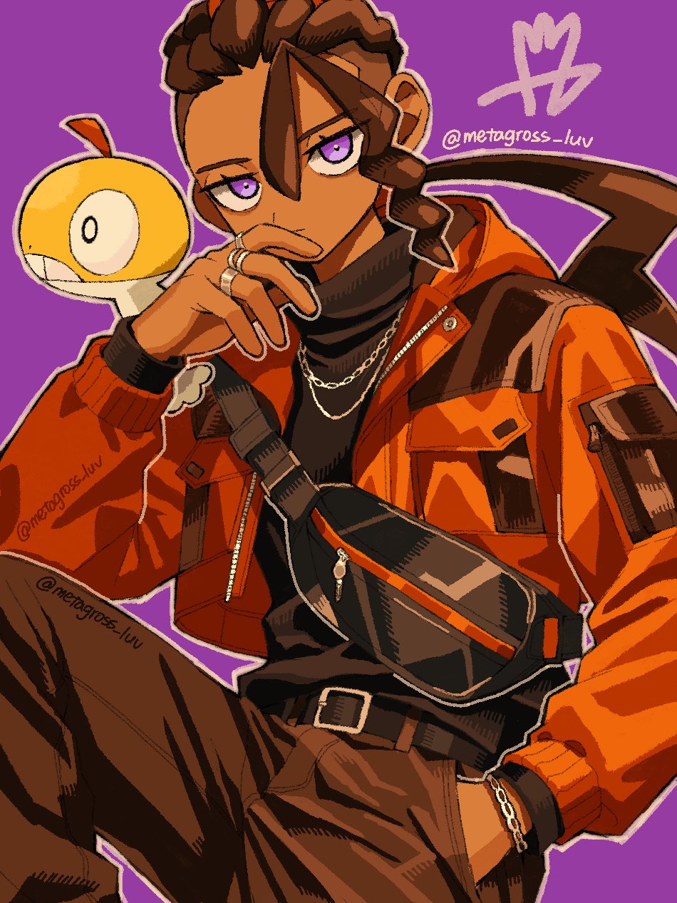 belt black_sweater bracelet brown_pants colored_skin cornrows dark-skinned_male dark_skin expressionless fanny_pack gen_5_pokemon hand_in_pocket highres jacket jewelry looking_at_viewer metagross_luv multiple_rings naveen_(pokemon) nintendo orange_jacket outline pants pokemon pokemon_legends:_z-a purple_background purple_eyes ring scraggy signature sweater teeth turtleneck turtleneck_sweater twitter_username white_outline yellow_skin zipper_pull_tab