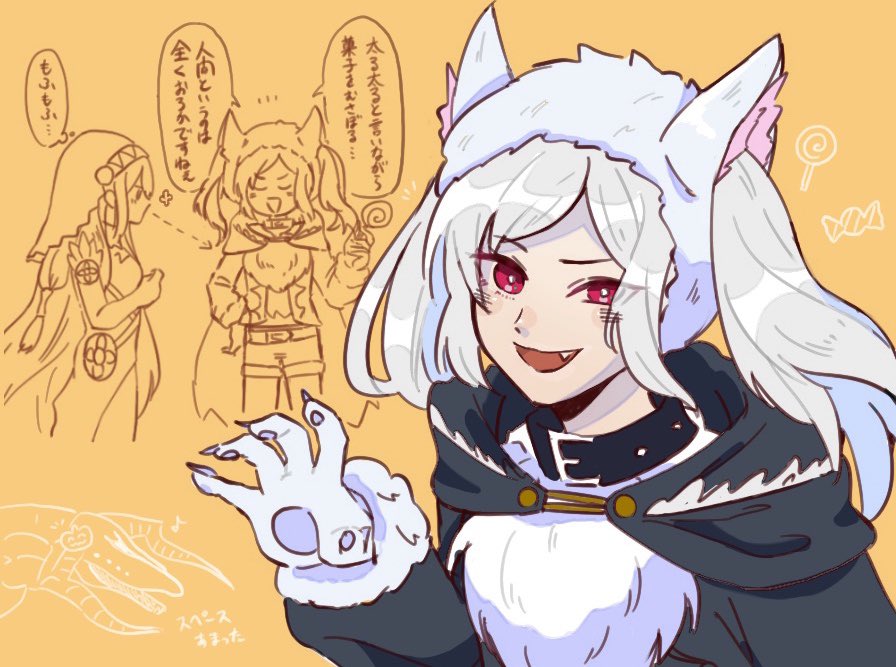 2girls animal_ears animal_hands azura_(fire_emblem) female_robin_(fire_emblem) female_robin_(grima)_(fire_emblem) female_robin_(grima)_(halloween)_(fire_emblem) fire_emblem fire_emblem_awakening fire_emblem_fates fire_emblem_heroes fur_trim gloves halloween_costume looking_at_viewer multiple_girls multiple_views nintendo official_alternate_costume paw_gloves red_eyes speech_bubble translation_request twintails twqk6 werewolf_costume white_hair wolf_ears wolf_paws