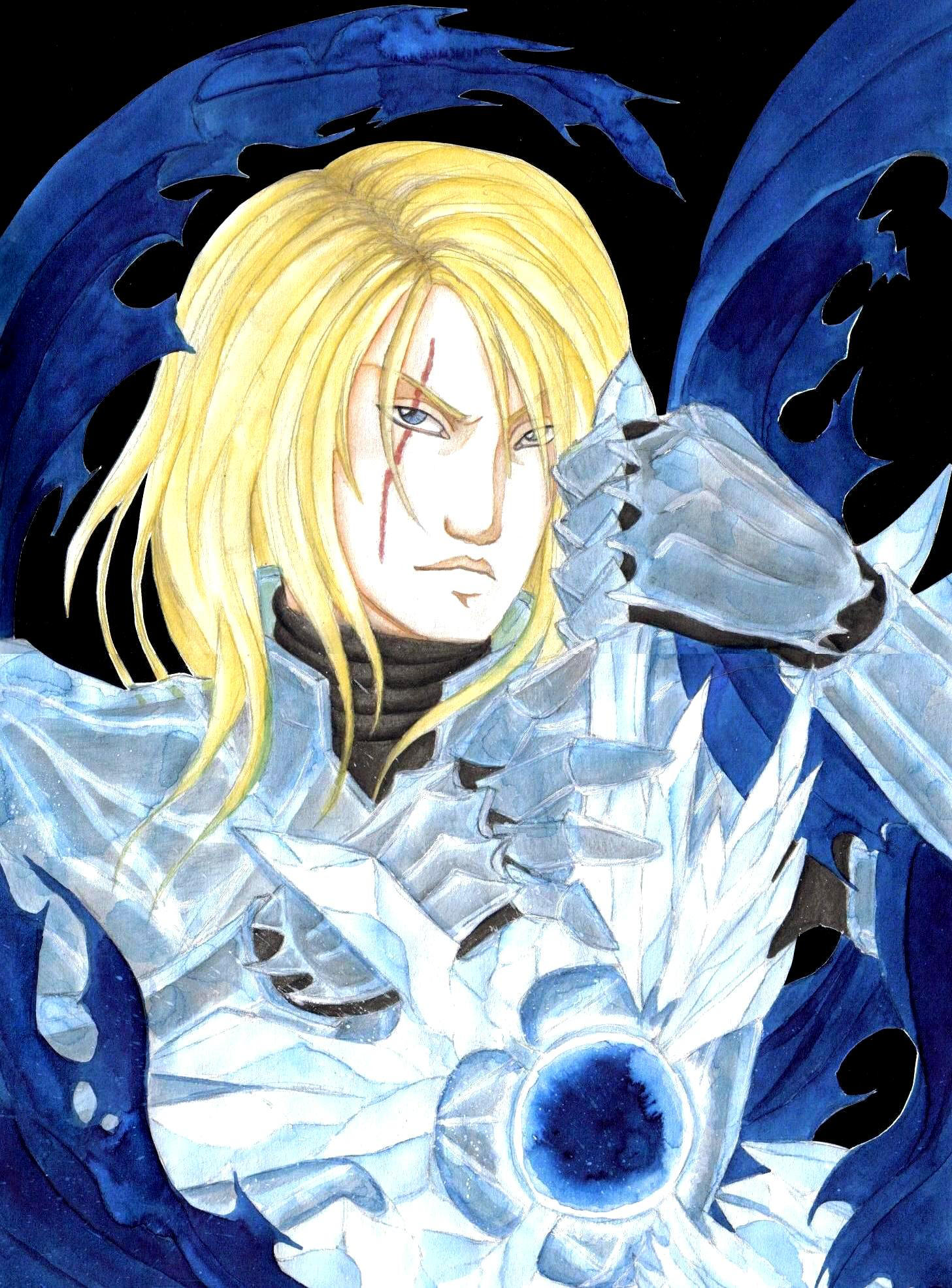1boy armor black_background blonde_hair blue_cape blue_eyes cape colored_pencil_(medium) commentary crystal crystal_armor crystal_sword english_commentary gauntlets greatsword highres holding holding_sword holding_weapon long_hair looking_at_viewer male_focus scar scar_across_eye scar_on_face shoulder_armor siegfried_schtauffen soul_calibur soul_calibur_(crystal_greatsword) soulcalibur soulcalibur_iv sword thefatalimpact traditional_media upper_body weapon