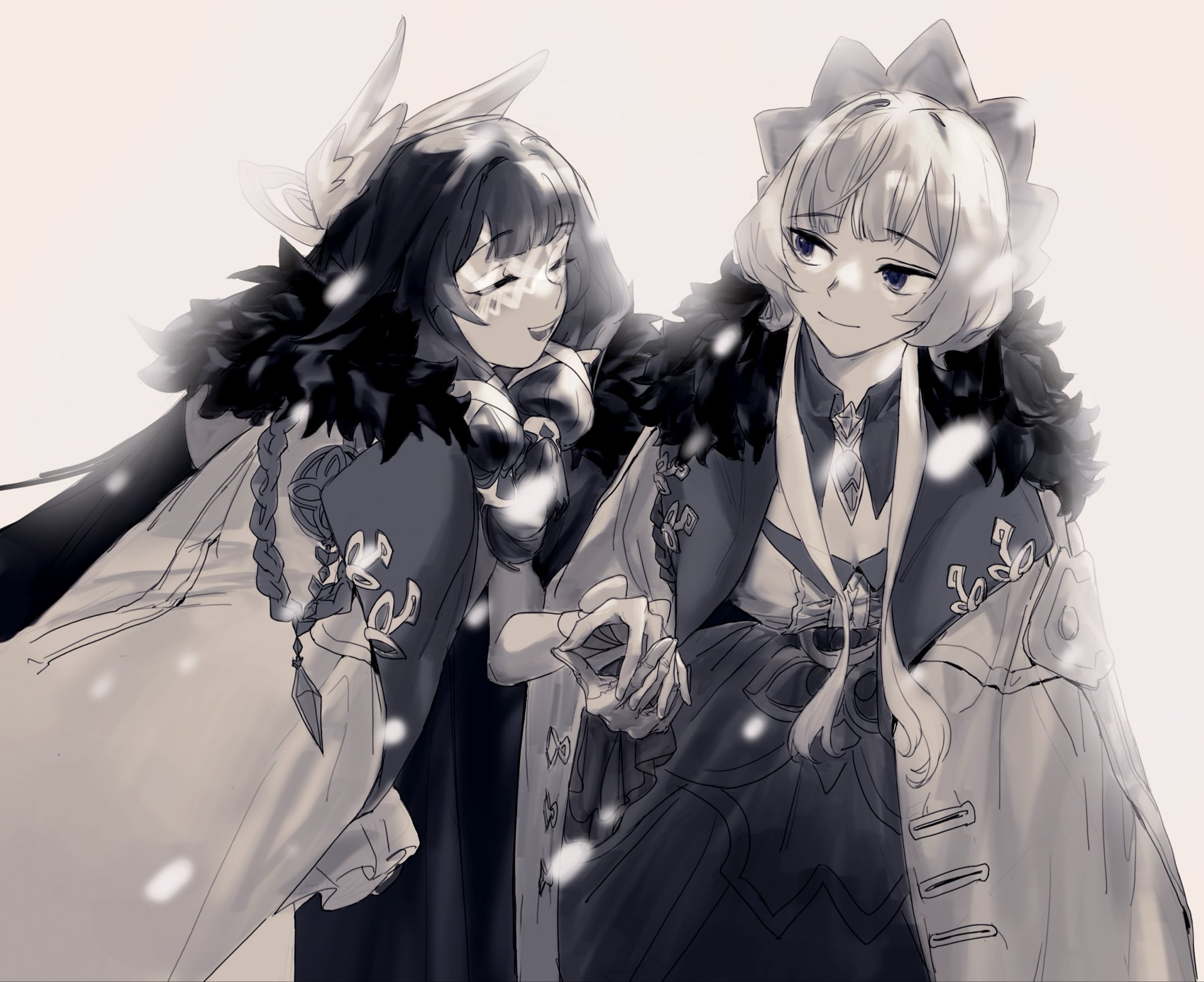 2girls blue_eyes bonnet breasts cleavage closed_eyes closed_mouth coat columbina_(genshin_impact) commentary detached_collar dress english_commentary eye_mask fatui_coat fur-trimmed_coat fur-trimmed_hood fur_hood fur_trim genshin_impact gloves greyscale hair_ornament hair_ribbon head_wings headdress highres holding_hands hood interlocked_fingers long_hair long_sidelocks looking_at_another mask monochrome multiple_girls multiple_wings open_mouth partially_colored ribbon sandrone_(genshin_impact) see-through_clothes see-through_mask short_hair_with_long_locks sidelocks simple_background smile tian_huwa unusually_open_eyes wing_hair_ornament wings winter_clothes winter_coat wrist_bow x-shaped_eyewear yuri