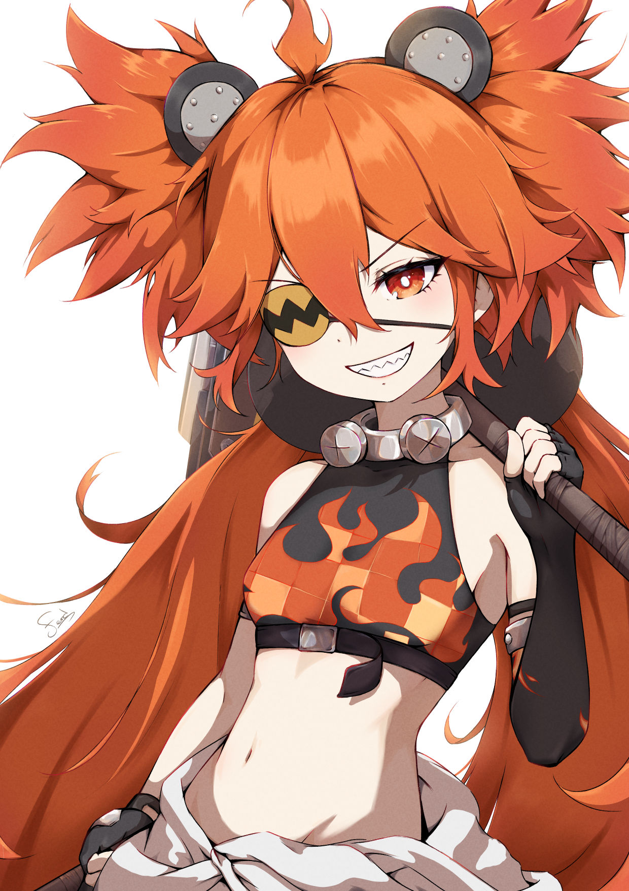 1girl ahoge asymmetrical_gloves bare_shoulders black_gloves breasts crop_top elbow_gloves eyepatch ferd_jk fingerless_gloves flame_print gloves hair_ornament hammer highres holding holding_hammer jumpsuit jumpsuit_around_waist koleda_belobog long_hair midriff navel red_eyes red_hair sharp_teeth small_breasts smile solo sphere_hair_ornament teeth twintails uneven_gloves very_long_hair white_background zenless_zone_zero