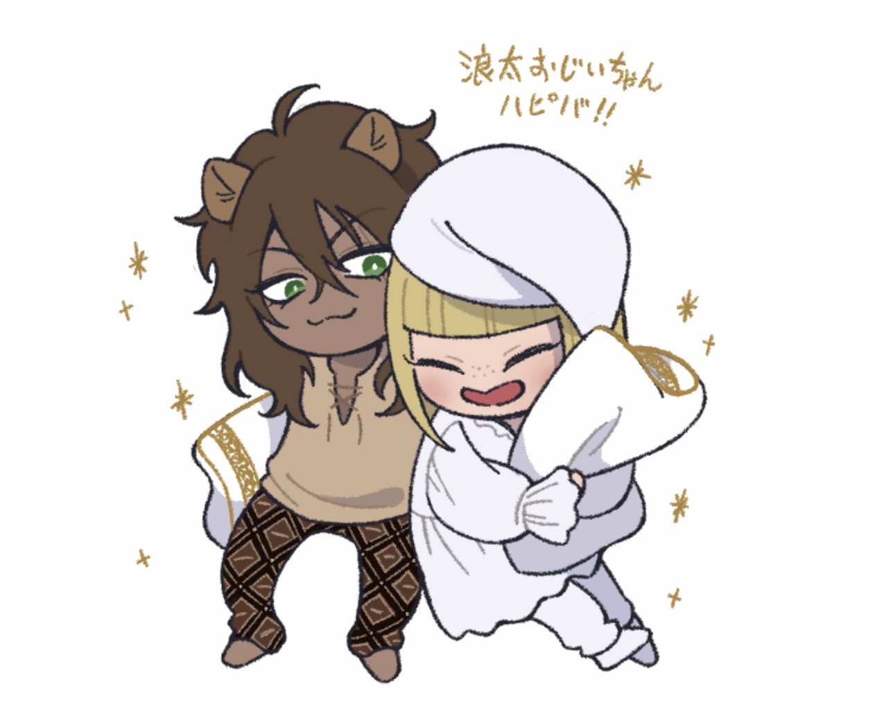 2boys animal_ears blonde_hair bob_cut brown_hair chibi closed_eyes dark-skinned_male dark_skin freckles green_eyes hat holding holding_pillow leona_kingscholar lion_boy lion_ears long_hair male_focus messy_hair multiple_boys nightcap pajamas pillow print_pajamas rook_hunt sayorihp shining short_hair sleepwear twisted_wonderland white_background white_pajamas yaoi