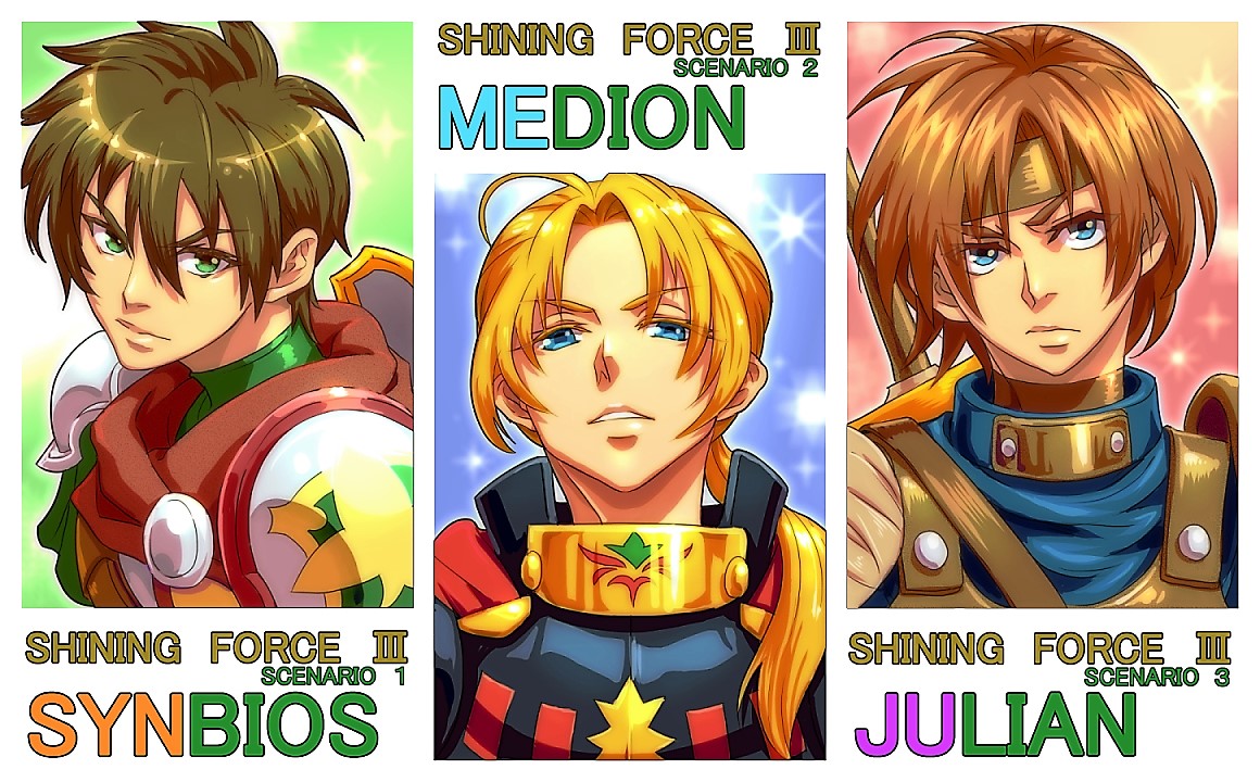 3boys annoyed armor asymmetrical_bangs blonde_hair blue_eyes brown_hair cape character_name character_profile character_request copyright_name english_text green_eyes looking_at_viewer multiple_boys nose okeko orange_hair shining_(series) shining_force_iii simple_background sparkle sword tagme upper_body weapon