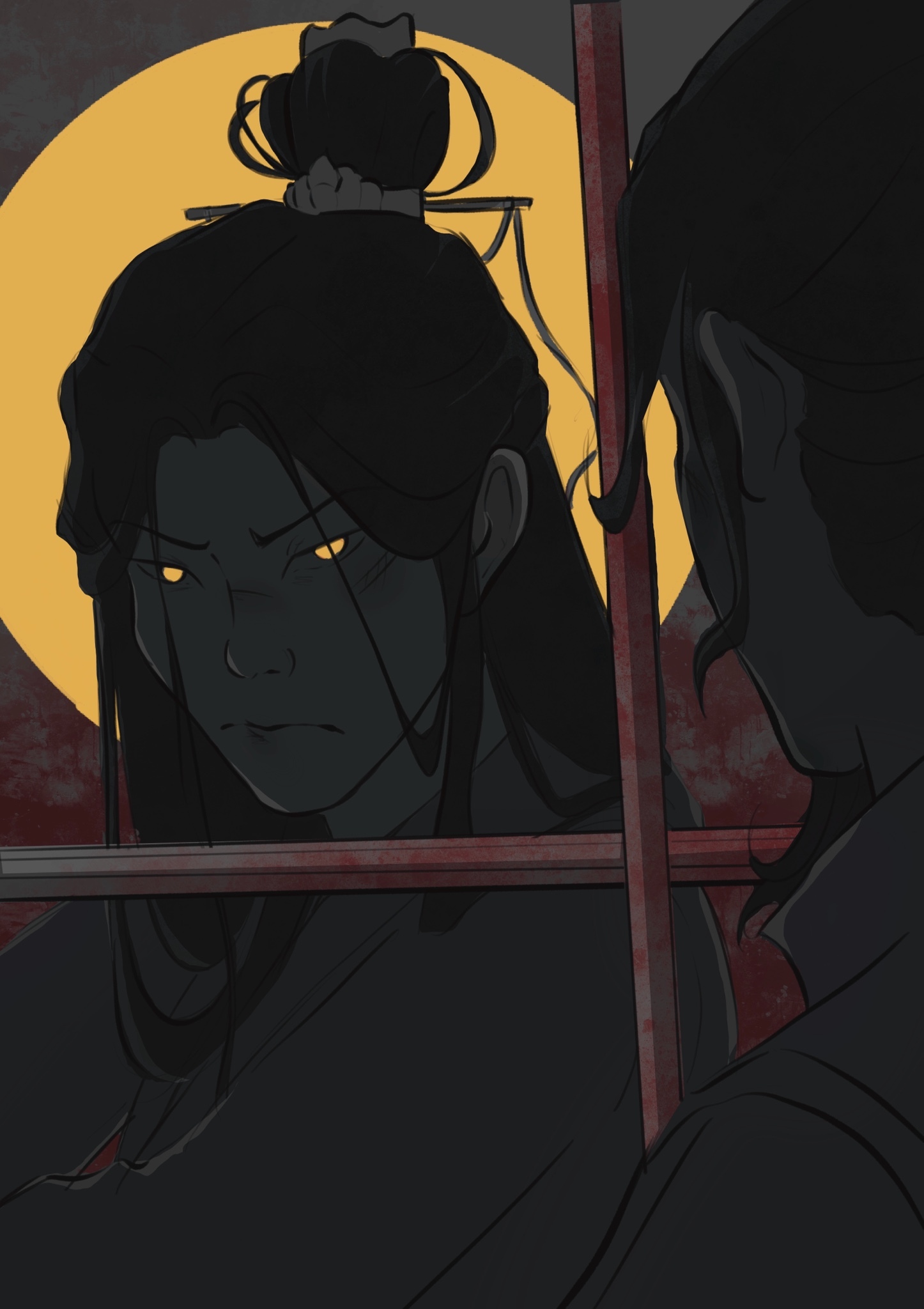 2boys black_hair blood bloody_weapon chinese_clothes closed_mouth collared_robe commentary english_commentary eye_contact from_behind frown glowing glowing_eyes grey_background halo highres liu_qingge long_hair looking_at_another looking_at_viewer male_focus multiple_boys no_pupils parted_bangs renzha_fanpai_zijiu_xitong ribboned_xiao_guan shen_jiu_(renzha_fanpai_zijiu_xitong) spot_color sword sword_fight uisgeart weapon xiao_guan_(headdress) yellow_eyes
