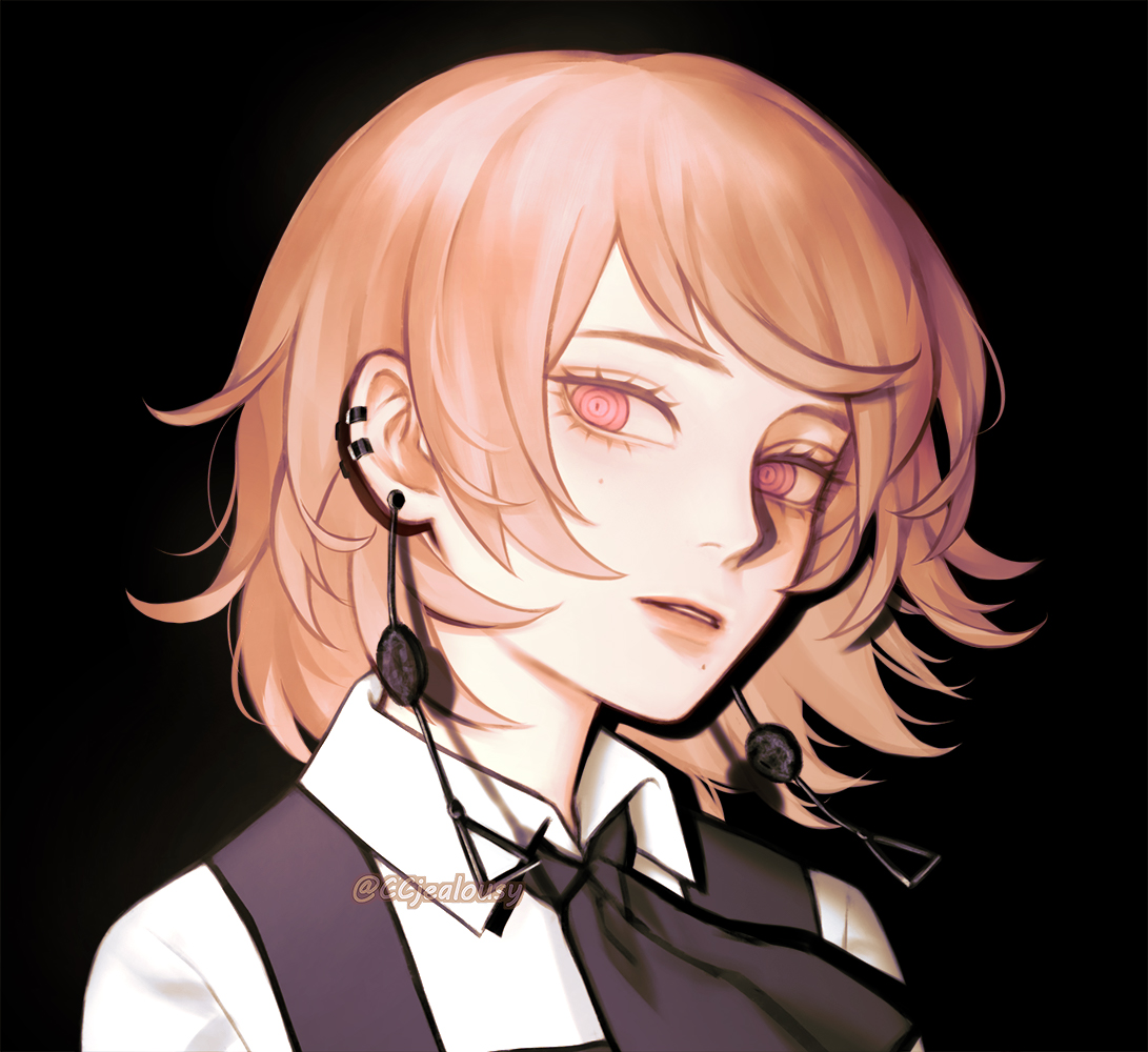 1girl blonde_hair chainsaw_man commentary czy_(2894456992) ear_piercing earrings expressionless fami_(chainsaw_man) fourth_east_high_school_uniform jewelry medium_hair mole mole_under_eye mole_under_mouth multiple_moles parted_lips piercing pink_eyes portrait ringed_eyes school_uniform solo