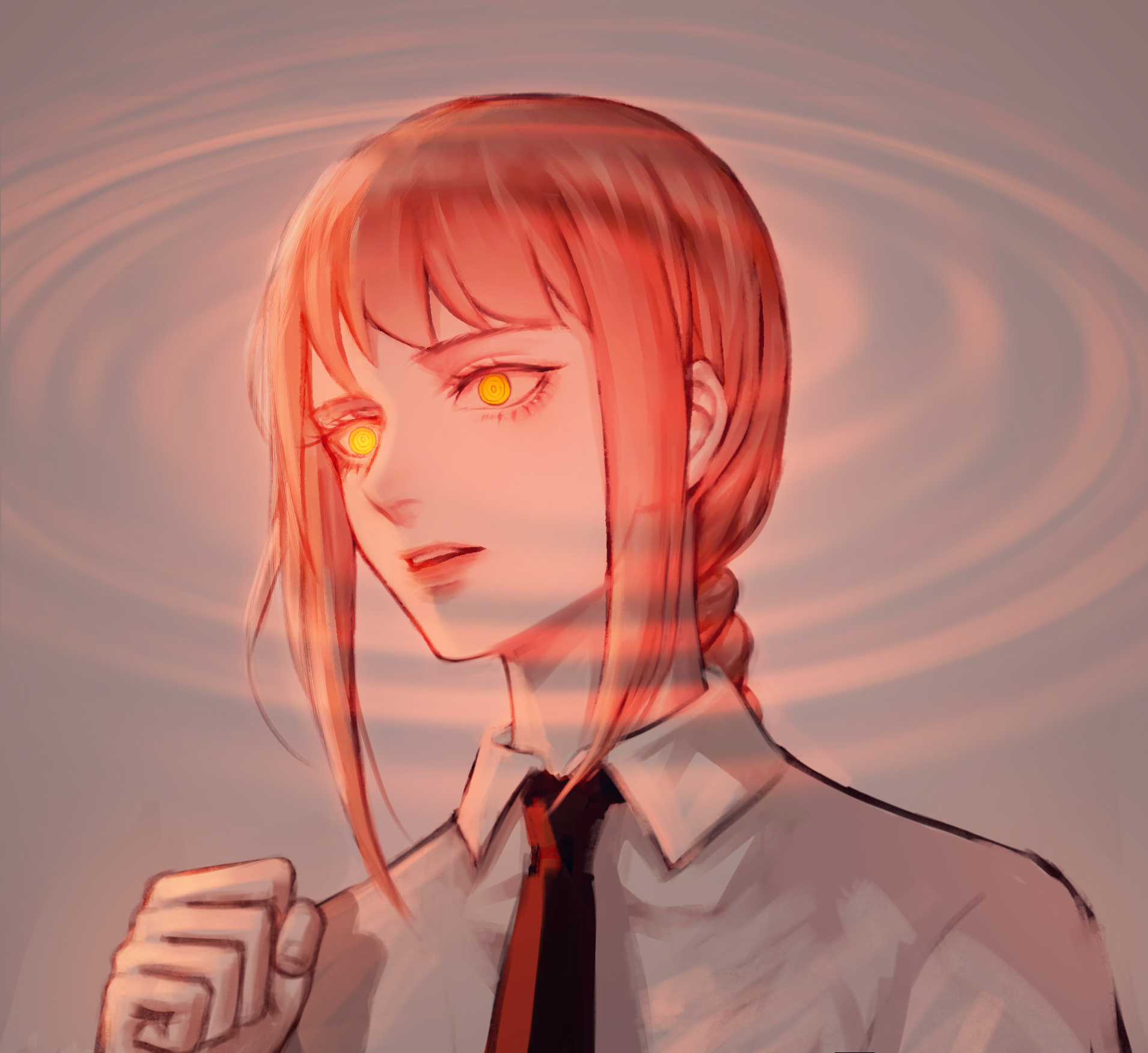 1girl black_necktie braid braided_ponytail chainsaw_man chinese_commentary commentary_request czy_(2894456992) highres makima_(chainsaw_man) necktie parted_lips portrait profile red_hair ringed_eyes shirt sidelocks single_braid solo white_shirt yellow_eyes